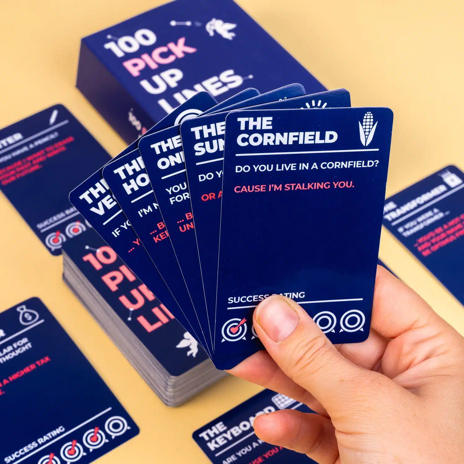 Hast du das Daten noch nicht satt, aber brauchst du ein paar starke Eröffnungssprüche? Die 100 Eröffnungssprüche Karten von Gift Republic sind eine praktische Hilfe. Auf diesen Karten stehen witzige und manchmal sehr unpassende Eröffnungssprüche, die du verwenden kannst, um Eindruck auf dein Date zu machen. Auf den Karten steht auch, wie erfolgreich der Eröffnungsspruch ist. Es wird dich also nicht überraschen, dass dieser Eröffnungsspruch nur 2 von 5 Punkten bekommt: Are you a shark? Because I’ve got some swimmers for you to swallow. Aber wir versprechen, dass es auch nette und erfolgreiche Eröffnungssprüche gibt.