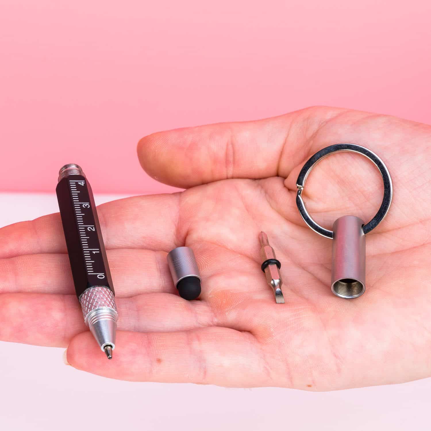 Mit dem 5-in-1 Mini-Multitool Stift von Gentlemenโs Hardware bist du immer gut vorbereitet, wenn du plรถtzlich etwas aufschreiben musst. Notizen, Einkaufslisten: Du notierst alles noch ganz klassisch mit Stift und Papier. Und mit diesem praktischen Multitool ist der Stift immer griffbereit: Er hรคngt nรคmlich an deinem Schlรผsselbund. Zusรคtzlich hat das Multitool noch weitere Funktionen: Es enthรคlt auch ein Lineal, einen Stylus und einen Schlitz- sowie Kreuzschlitzschraubendreher.