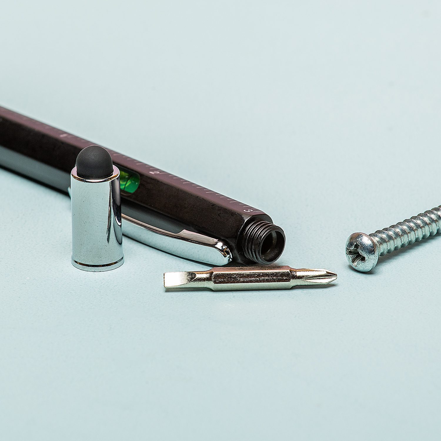 Ein Kugelschreiber ist immer praktisch in der Tasche oder Brusttasche. Und mit dem 6-in-1-Multitool-Stift sind Sie immer auf das Unerwartete vorbereitet. Ist eine Schraube locker? Mit diesem Stift haben Sie sie im Handumdrehen wieder festgezogen. Möchten Sie überprüfen, ob Sie etwas gerade aufgehängt haben? Verwenden Sie dann die Wasserwaage, die sich im Stift befindet. Neben einem Kreuz- und Schlitzschraubendreher sowie einer Wasserwaage enthält der Multitoolstift auch einen Stift und ein Lineal. Und natürlich können Sie mit dem Multitool-Stift auch einfach schreiben! Die Schraubendreher finden Sie, wenn Sie die Rückseite des Stifts entfernen.