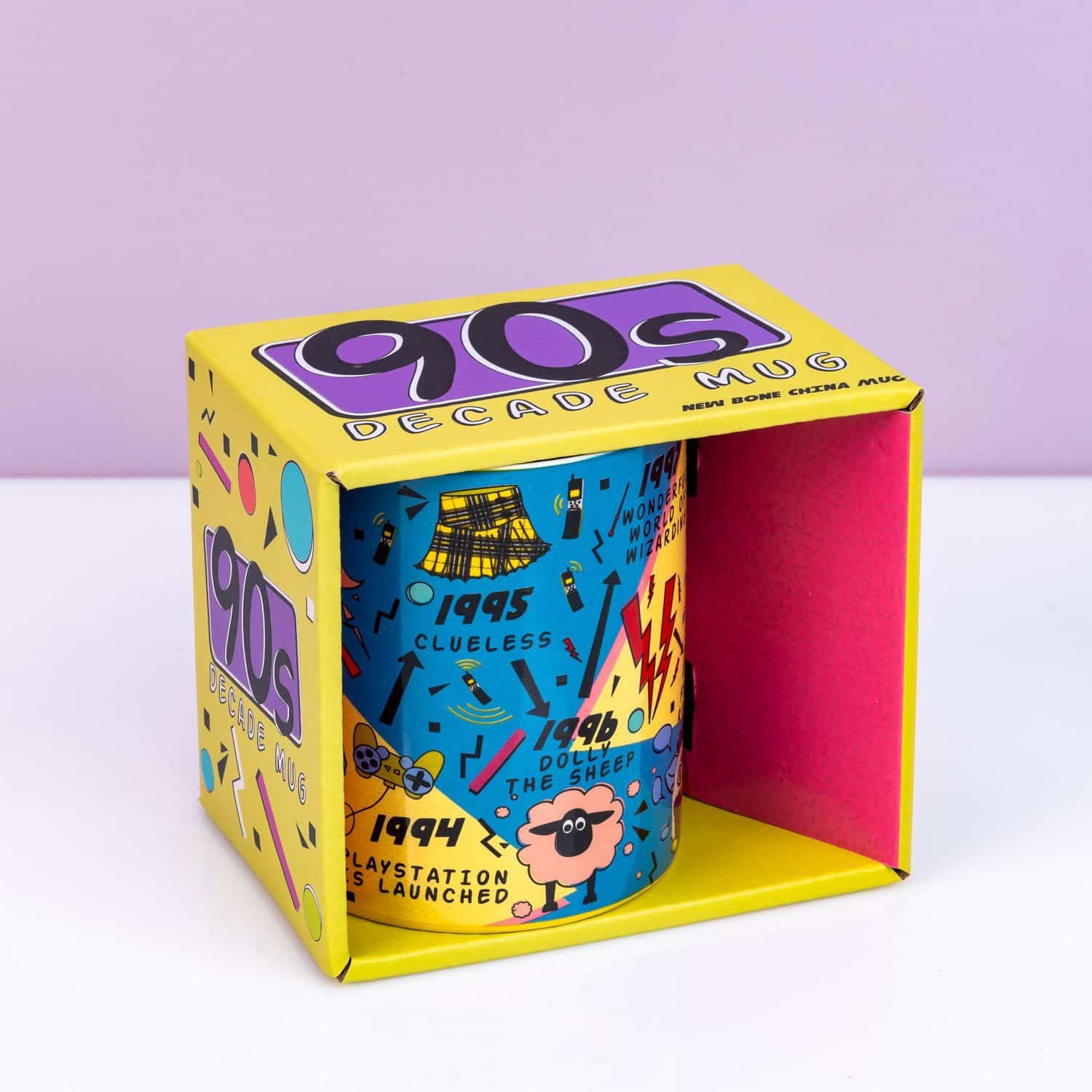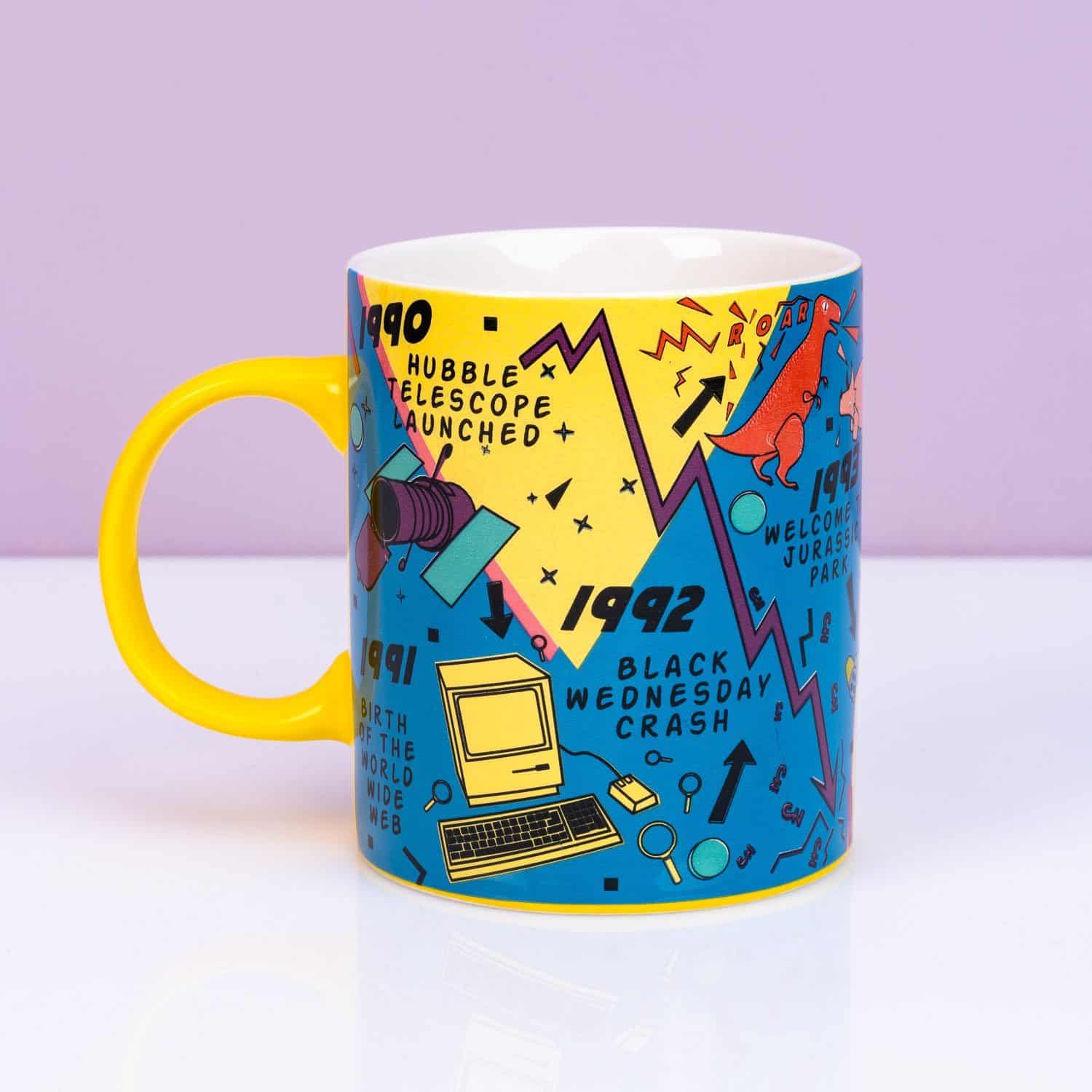 Sind aufblasbare Stรผhle und elektronische Haustiere, die gefรผttert werden mรผssen, nichts Neues fรผr dich? Dann bist du wahrscheinlich ein Kind der 90er. Speziell fรผr alle, die in den 80er Jahren geboren und in den 90ern aufgewachsen sind, bieten wir die originelle 90er Jahre Tasse von Gift Republic an. Diese frรถhliche Tasse ist bedruckt mit ikonischen Momenten aus der Popkultur und Geschichte dieser Zeit. Denke zum Beispiel an den Launch der PlayStation und des Hubble-Teleskops, aber auch an das Klonen von Dolly, dem Schaf, und die Verรถffentlichung von Furbies.