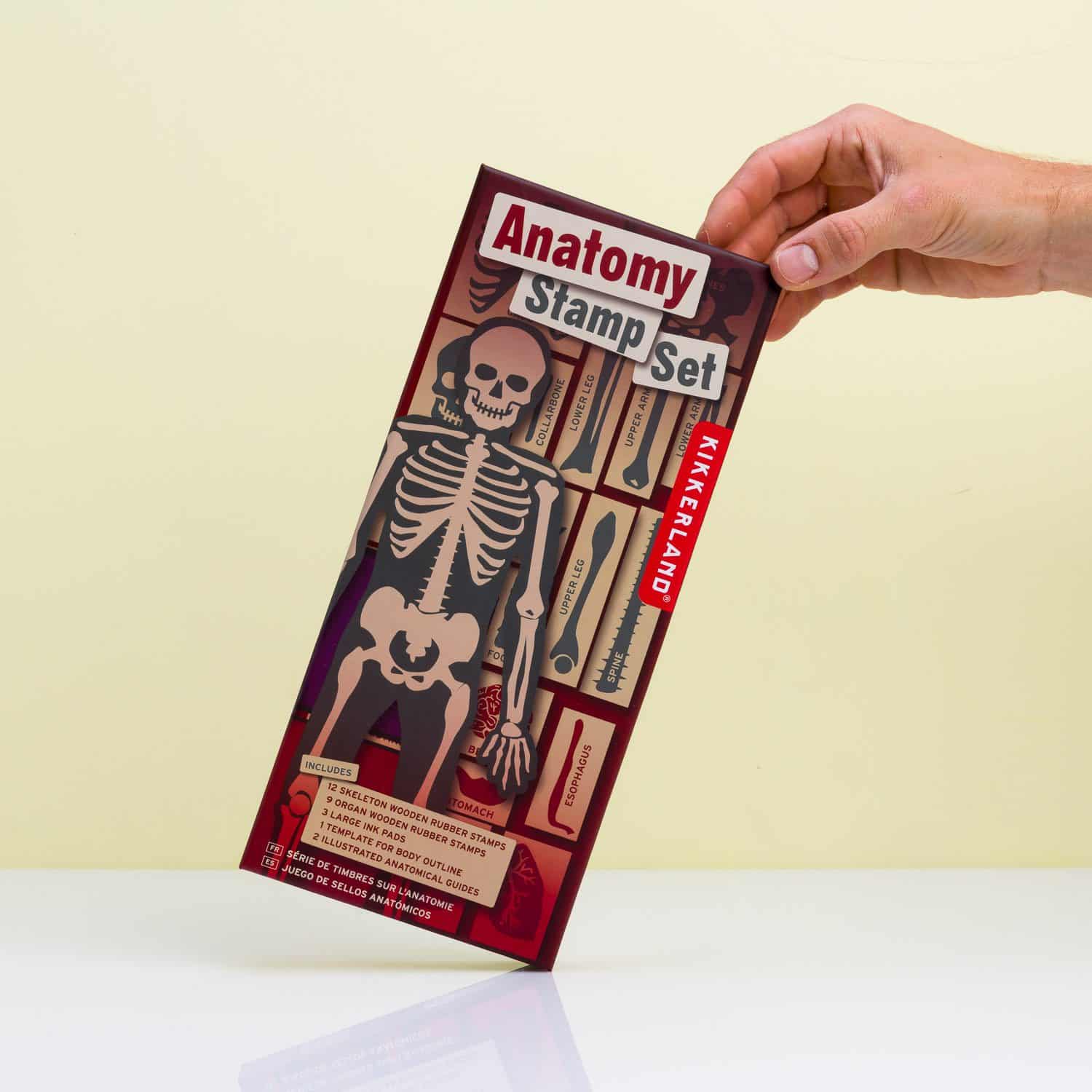 Originell und lehrreich: das ist das Anatomy-Stempelset von Kikkerland. Ein Stempelset, in dem Sie lernen, wie Sie von innen aussehen. Es ist ein schönes Geschenk für Kinder, aber ebenso lehrreich für Eltern. Das Set besteht aus 21 Stempeln (zwölf für das Skelett, neun für die Organe), drei Stempelblöcken, einem Beispiel zum Nachzeichnen und natürlich einer Erklärung zu den Organen und Knochen.