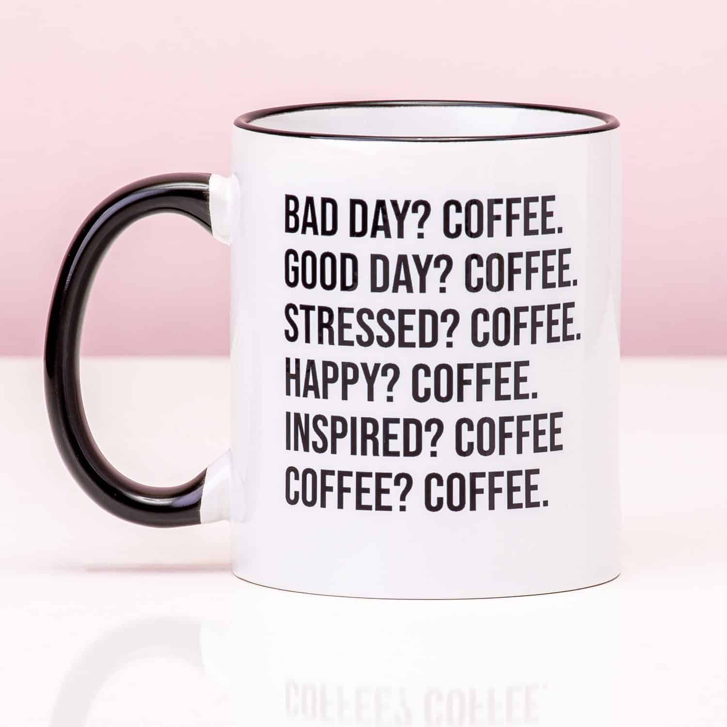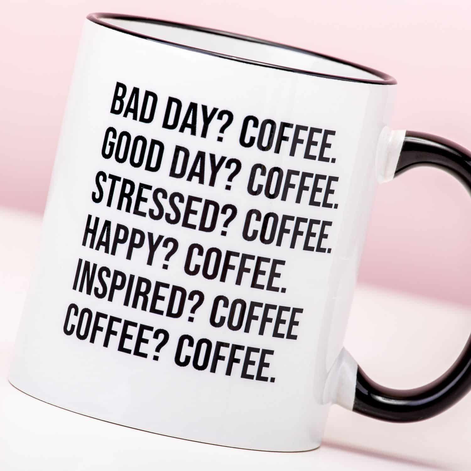 Bist du absolut verrรผckt nach Kaffee? Oder suchst du ein persรถnliches Geschenk fรผr einen Kaffeeliebhaber? Die Bad Day Coffee Tasse ist die Antwort auf all deine Fragen. Diese lustige Tasse hat einen Text, der zeigt, dass Kaffee alles besser macht. Bad day? Coffee. Good day? Coffee. Stressed? Coffee. Happy? Coffee. Inspired? Coffee. Coffee? Coffee. Das heiรt: Kaffee ist immer eine gute Idee, egal ob du einen groรartigen oder einen schlechten Tag hast. Diese einzigartige Tasse begleitet dich durch den Arbeitstag, aber ist auch eine prima Tasse beim Anschauen eines Films.