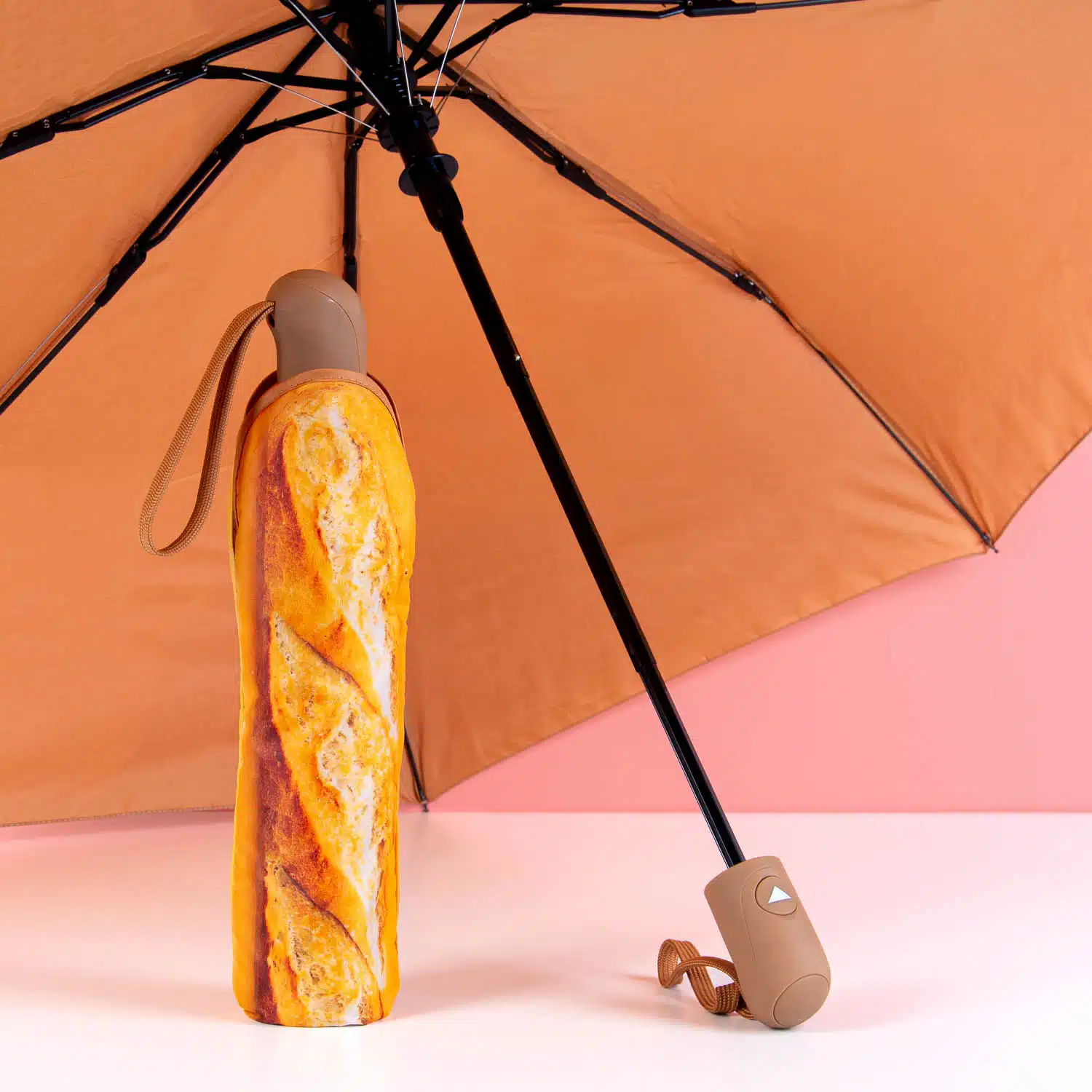 Der Baguette-Regenschirm von Kikkerland bringt gute Laune an grauen Regentagen. Dieser originelle Regenschirm wird in einer Hülle geliefert, die wie ein knuspriges Baguette aussieht! Der kompakte Schirm passt bequem in eine Tasche oder Jackentasche – aber mit seinem witzigen Design möchtest du ihn am liebsten jedem zeigen. Trägst du ihn am Trageband, sieht es aus, als würdest du mit einem Baguette durch die Stadt spazieren.