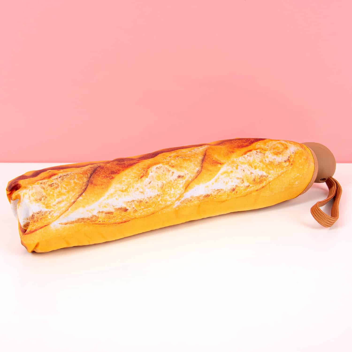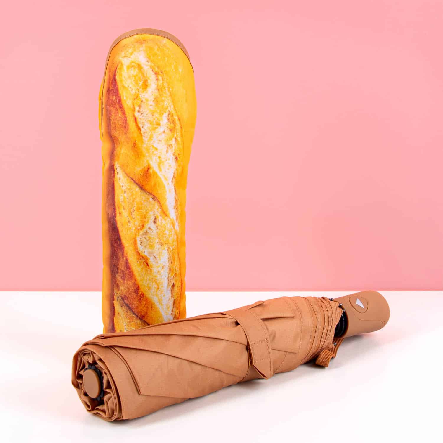 Der Baguette-Regenschirm von Kikkerland bringt gute Laune an grauen Regentagen. Dieser originelle Regenschirm wird in einer Hรผlle geliefert, die wie ein knuspriges Baguette aussieht! Der kompakte Schirm passt bequem in eine Tasche oder Jackentasche โ aber mit seinem witzigen Design mรถchtest du ihn am liebsten jedem zeigen. Trรคgst du ihn am Trageband, sieht es aus, als wรผrdest du mit einem Baguette durch die Stadt spazieren.