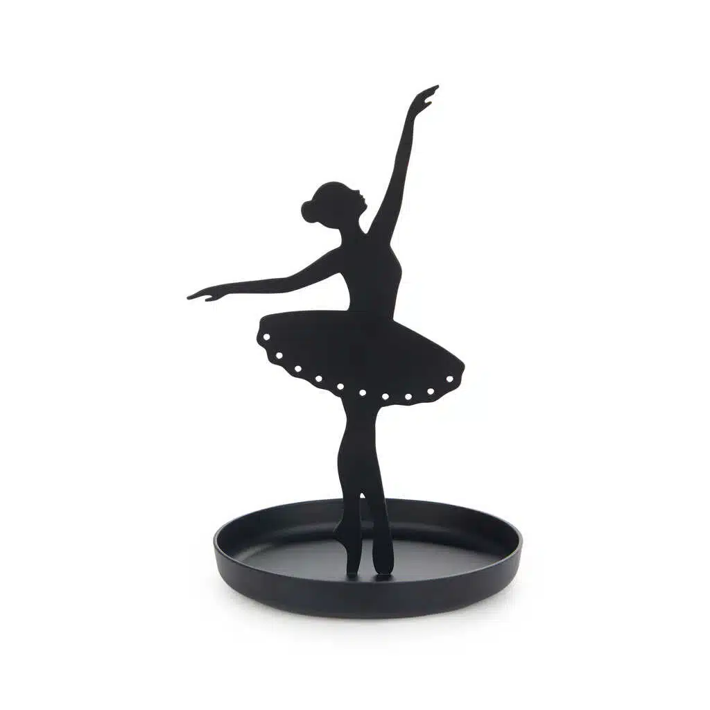 Pirouette! Der Ballett Schmuckhalter von Balvi ist ein schwarzer Schmuckhalter in Form einer Ballerina-Silhouette. Hรคnge deine Ringe, Ketten und Armbรคnder an die elegante Ballerina, die einen charmanten Touch zu deiner Frisierkommode oder deinem Badezimmer bringt. Mit rutschfesten Stรผtzpunkten bleibt alles schรถn an seinem Platz. Ein anmutiges Geschenk fรผr Schmuck-Liebhaber!