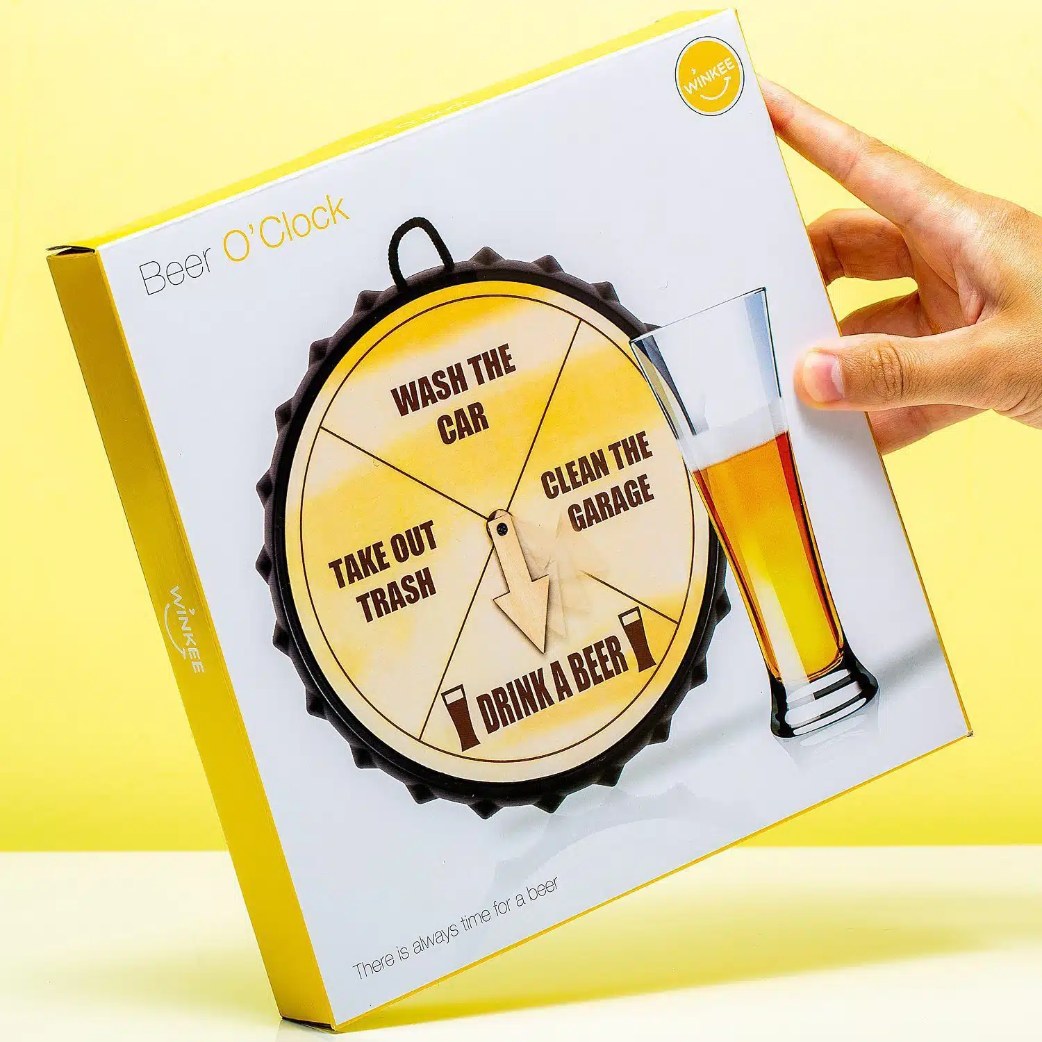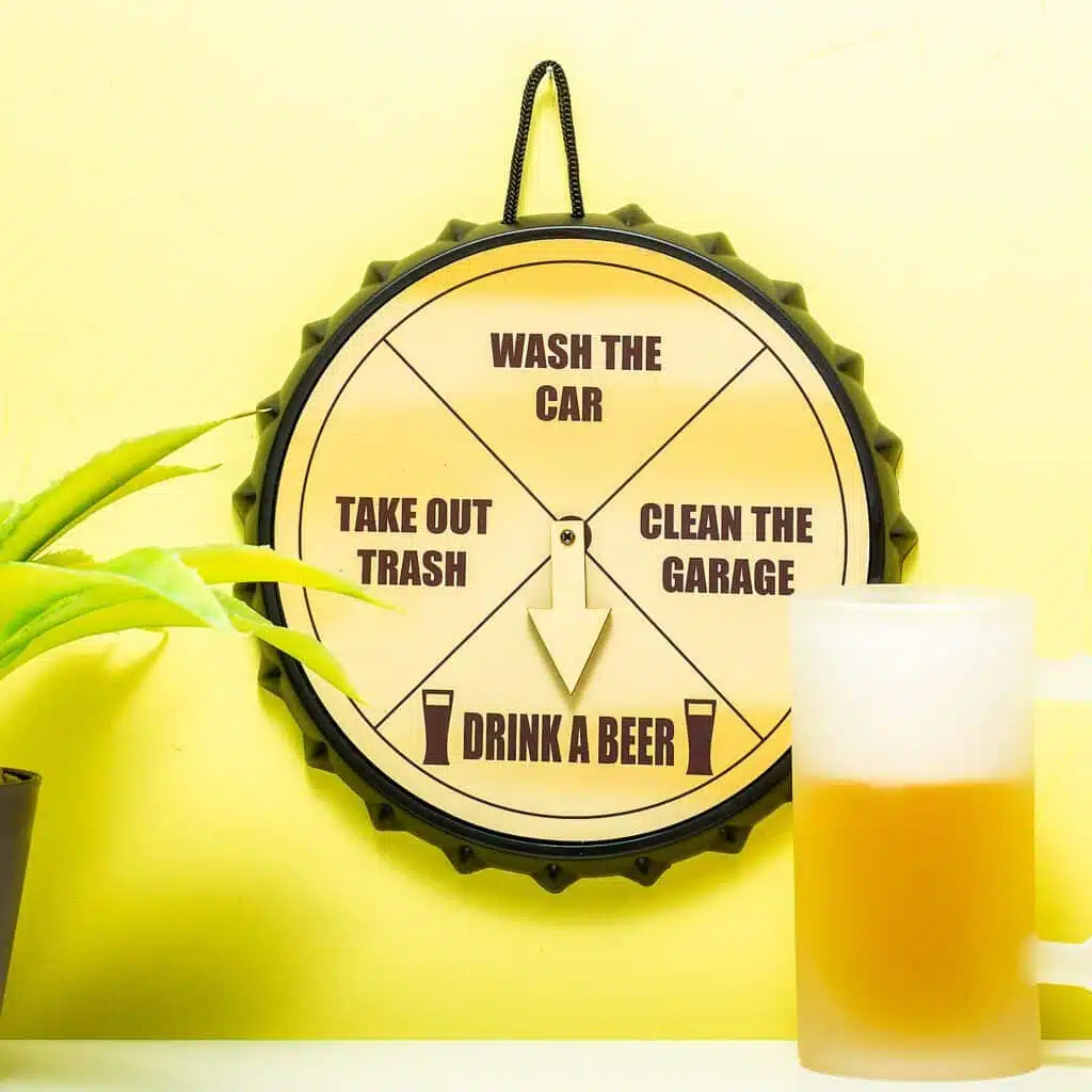 Das Auto waschen, die Garage aufräumen oder den Müll rausbringen – alles nützliche, aber nicht wirklich spaßige Aufgaben. Zum Glück gibt es beim Beer o’clock Trinkspiel von Winkee auch eine vierte, unterhaltsame Option: Bier trinken! Und dank der Schwerkraft wird der Pfeil, egal wie fest du ihn drehst, immer bei dieser letzten Option landen. Das Spiel, in Form eines Kronkorkens, kann aufgehängt oder hingestellt werden. Genau das, was deine Männerecke braucht!