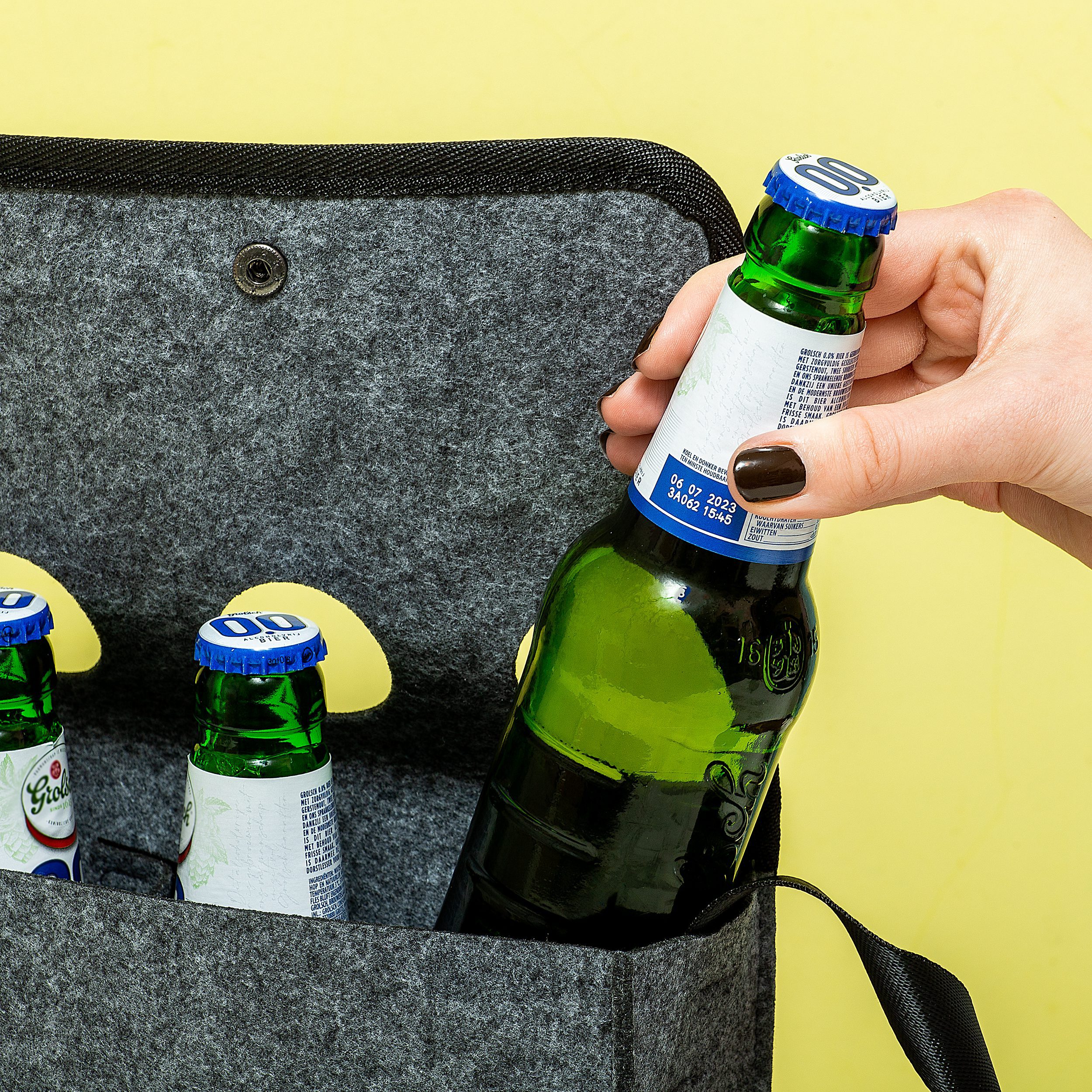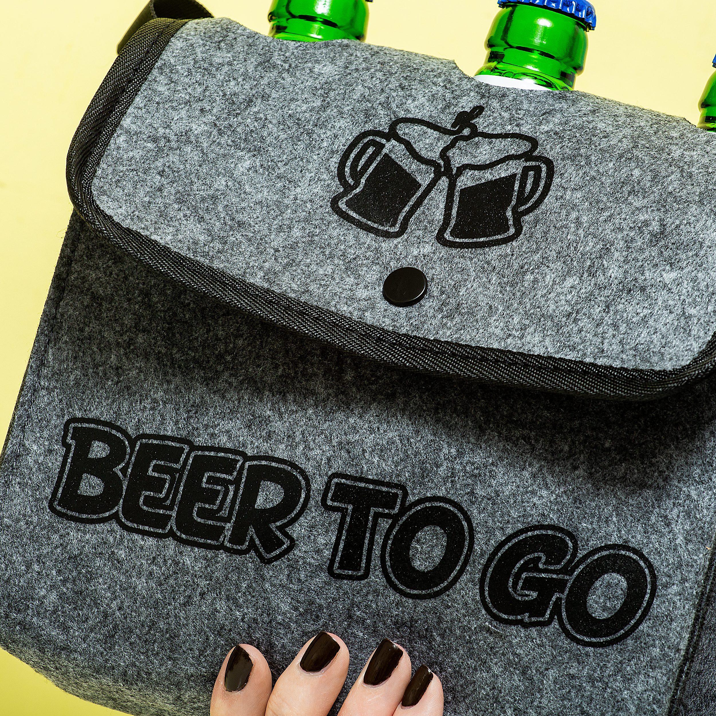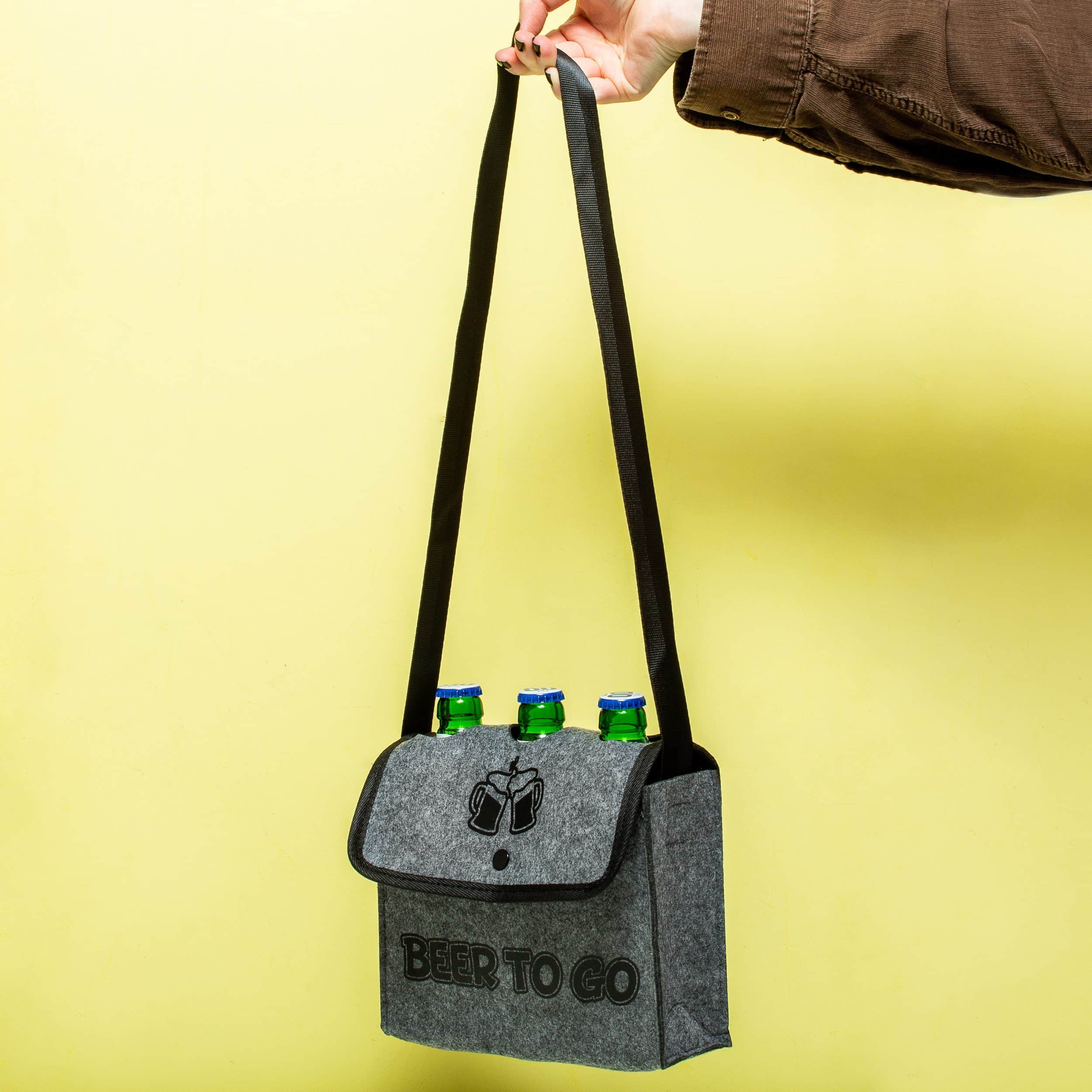 Möchten Sie ein originelles Geschenk für einen Bierliebhaber? Schenken Sie ihm oder ihr die Umhängetasche Beer To Go! Diese lustige Biertüte sorgt dafür, dass Sie drei Flaschen Bier sicher mitnehmen können.Die Filz Umhängetasche hat mehrere Fächer und oben eine Öffnung für die Hälse der Flaschen. Ein ideales Geschenk, wenn Sie Ihr eigenes Bier zu einem Grillfest oder einer anderen Party mitbringen müssen.