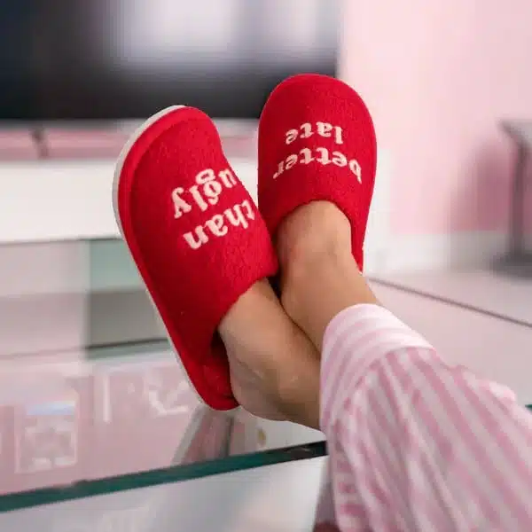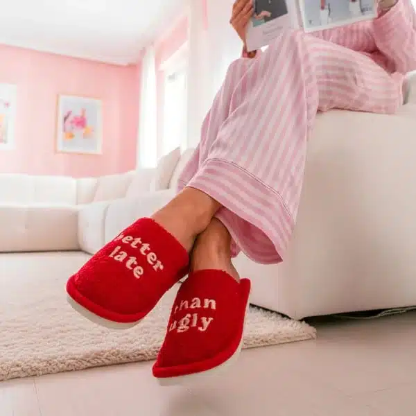 - Hausschuhe mit “Better Late Than Ugly” Text