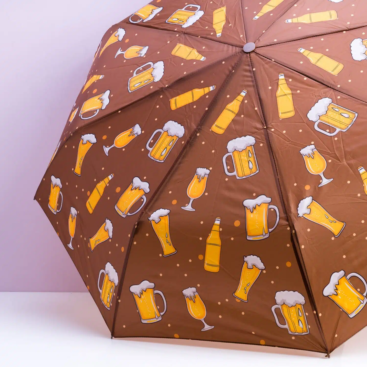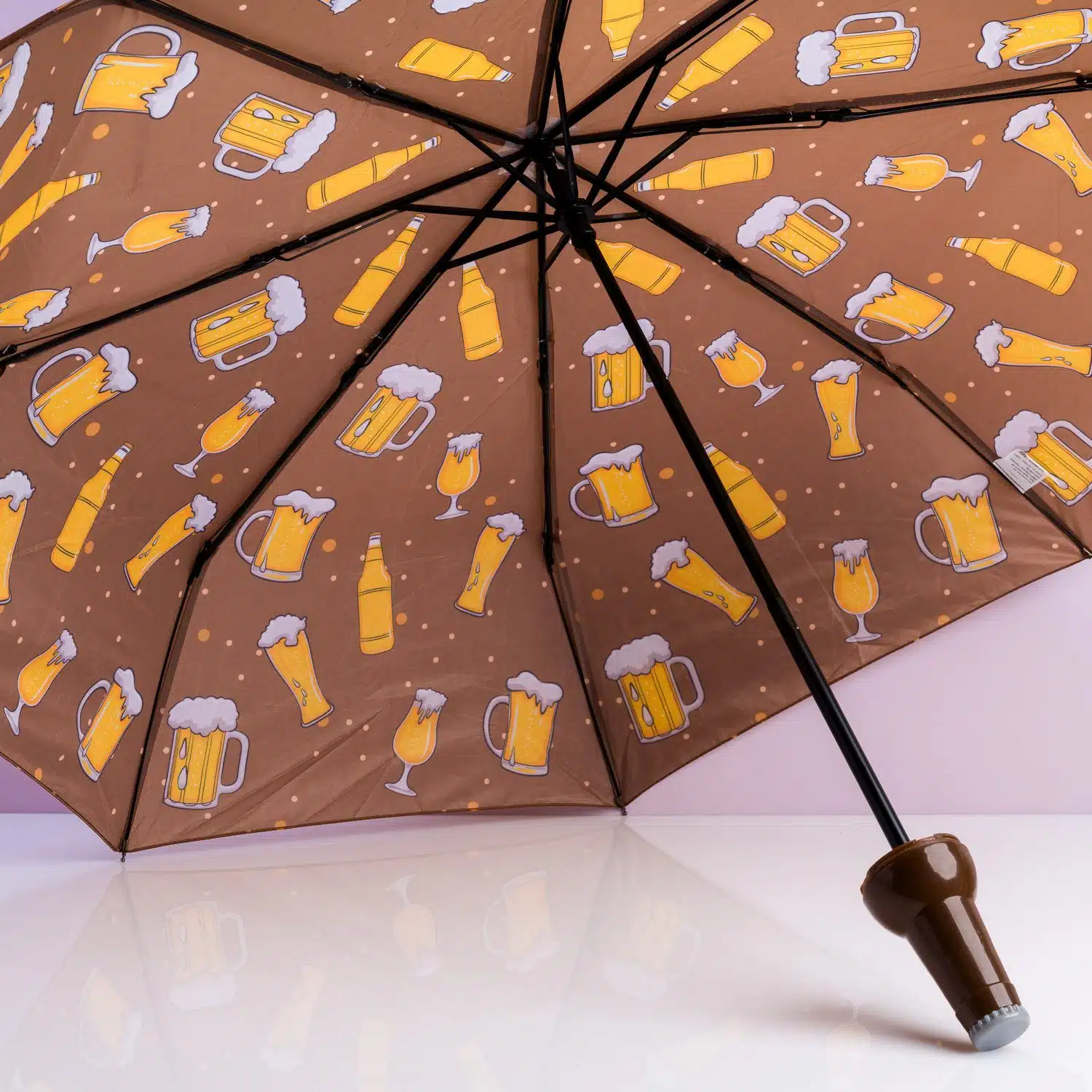 Bier ist Ihr Lieblingsgetränk und jeder sollte es wissen. An regnerischen Tagen tragen Sie daher stolz den Bierflaschenschirm von Out of the Blue. Dieser einzigartige Regenschirm sieht aus wie eine Flasche Bier in der Röhre. Der Hals der Bierflasche ist der Griff des Regenschirms. Auf dem braunen Regenschirm selbst stehen allerlei Gläser und Bierflaschen.
