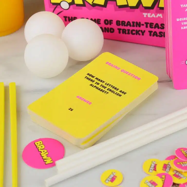Das Brains vs Brawn Spiel von Gift Republic ist das ultimative Partyspiel, bei dem Gehirn und Geschicklichkeit gegeneinander antreten. Beantworte knifflige Wissensfragen oder fรผhre verrรผckte physische Herausforderungen aus. Wer gewinnt: die Schlaukรถpfe oder die Sportlichen? Dieses Spiel enthรคlt Karten mit Fragen und Herausforderungen, Wรผrfel und alles, was du fรผr einen urkomischen Spieleabend brauchst.