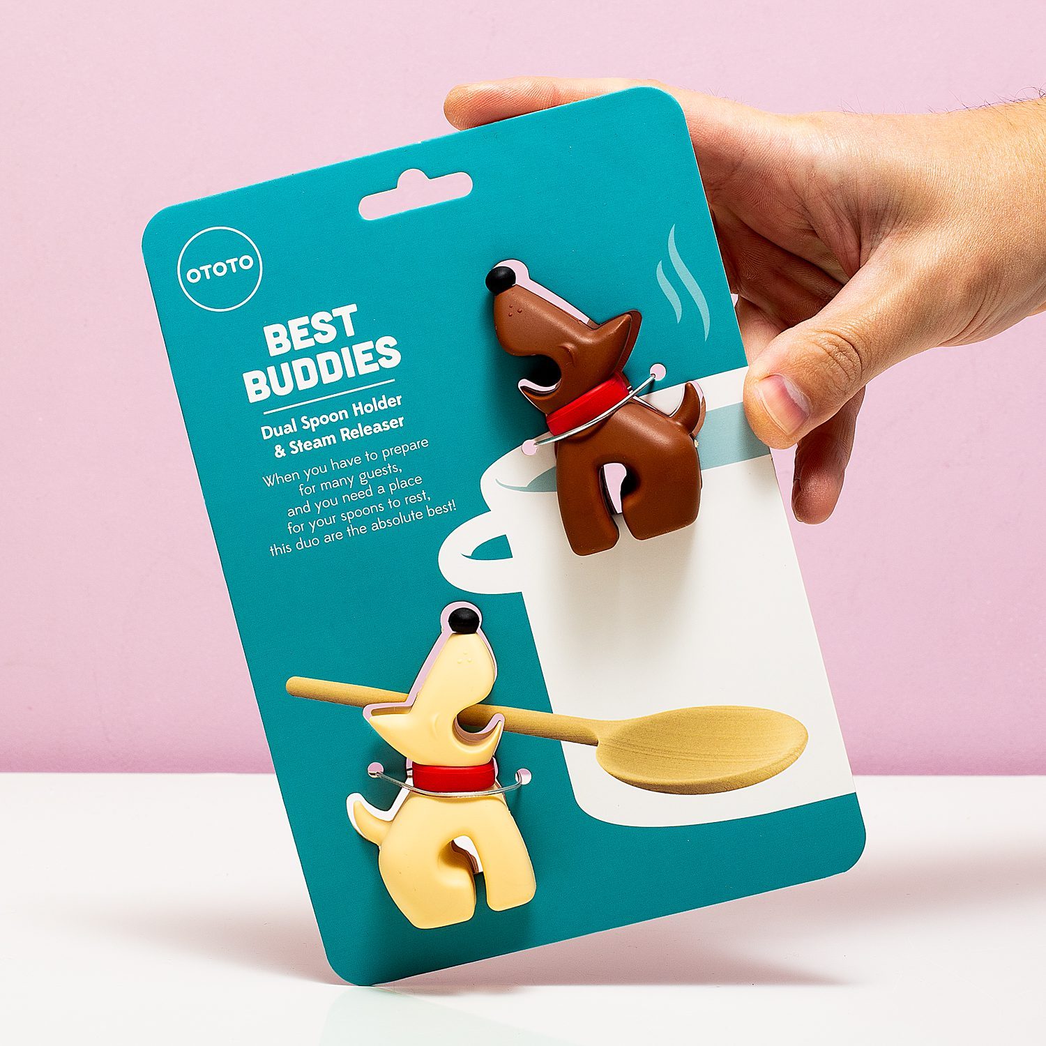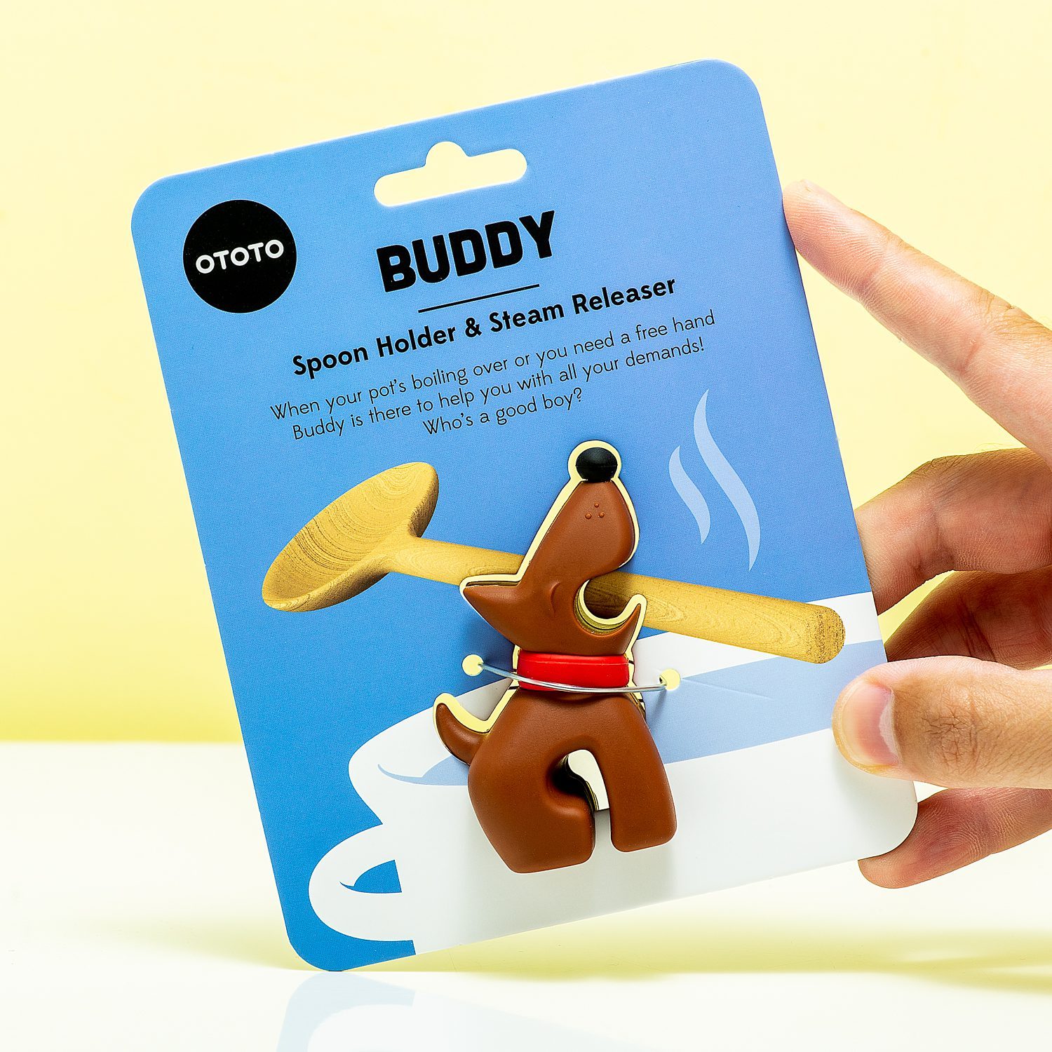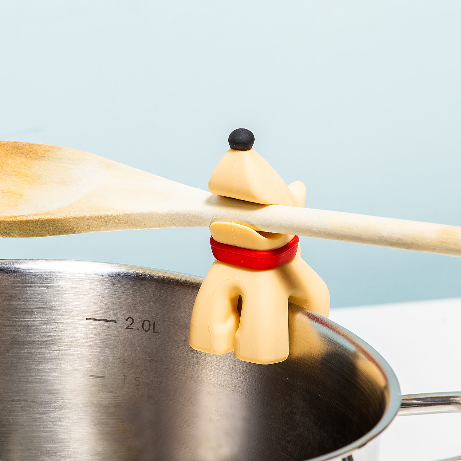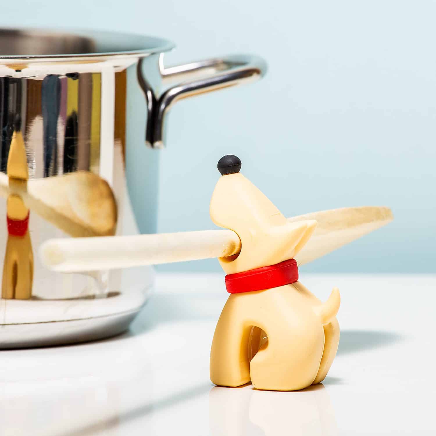 Hey Küchenprinz! Hast du oft das Problem, dass Pasta überkocht? Keine Sorge, das kann dem Besten passieren. Aber mit dem Buddy Löffelhalter und Dampfablass von Ototo ist die Chance auf ein sauberes Kochen ohne Sauerei viel größer. Dieser praktische Silikonhund sorgt dafür, dass der Dampf aus dem Topf entweichen kann: Der Deckel ruht nämlich auf seinem Schwanz. Außerdem kannst du deinen Kochlöffel in seinem Maul einklemmen, damit deine Arbeitsfläche sauber bleibt. Ein unverzichtbarer Küchenhelfer für unordentliche Köche. Auch als Set von zwei erhältlich.