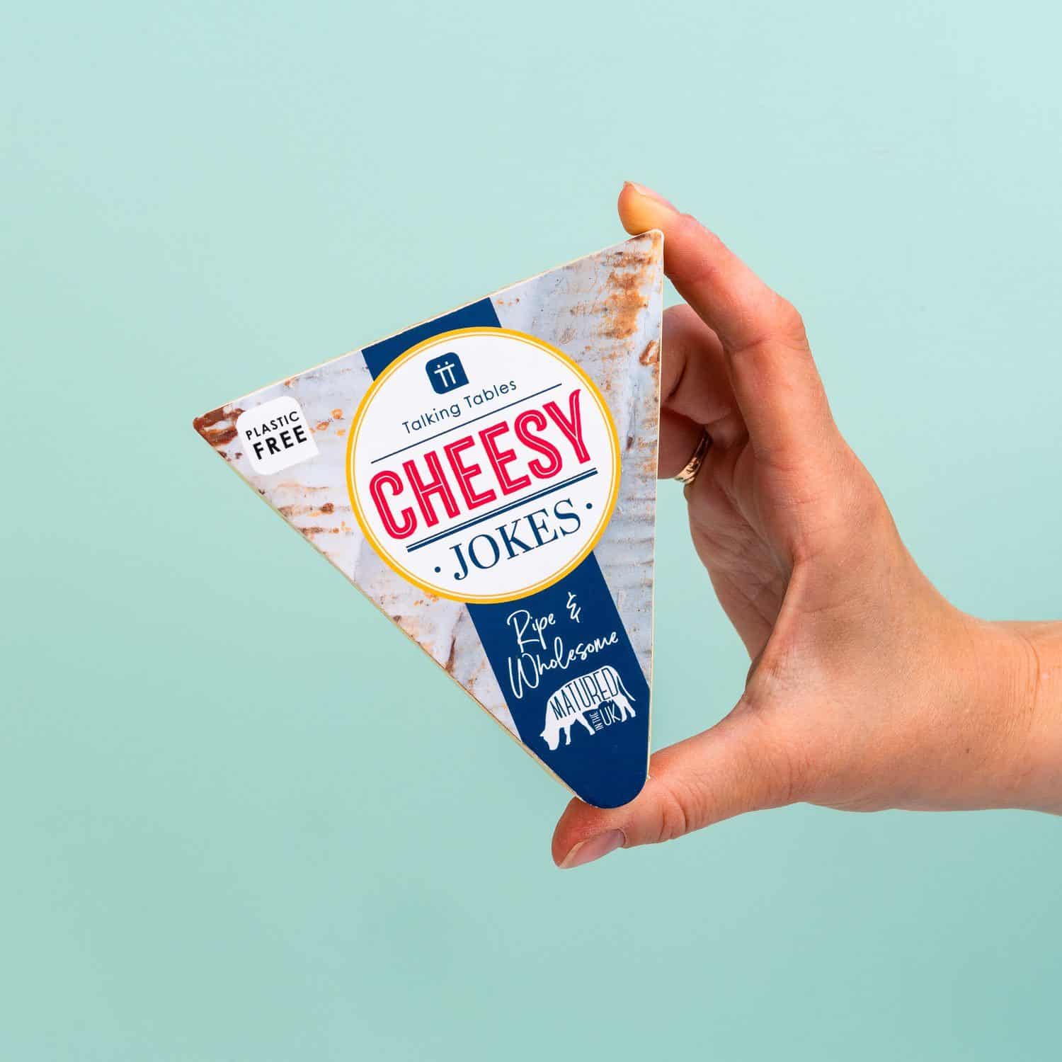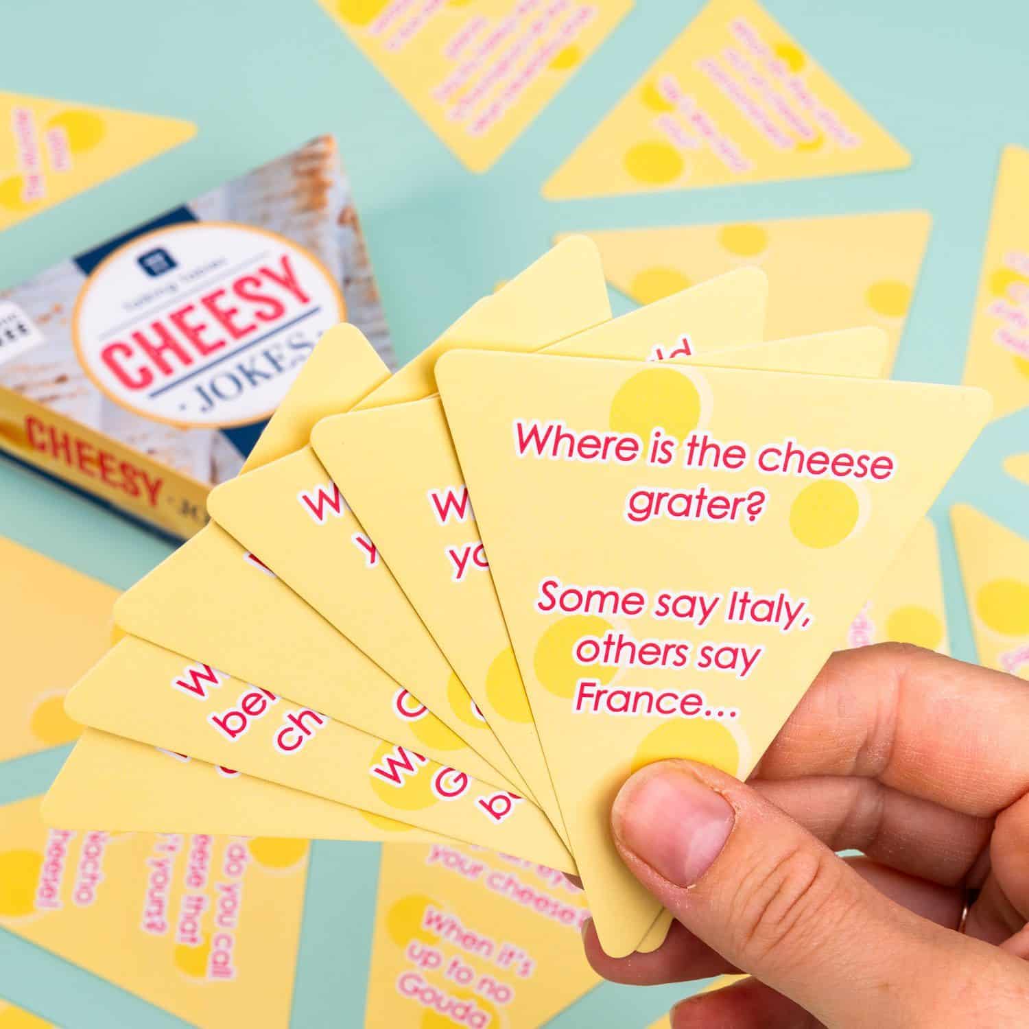 Es ist die ideale Kombination nach einem gemรผtlichen Abendessen mit Freunden: eine Kรคseplatte mit den Cheesy Jokes von Talking Tables. So kรถnnt ihr ein leckeres Stรผck Kรคse genieรen, wรคhrend jemand die cheesy jokes vorliest. Die Witze sind in einem Dรถschen verpackt, das wie ein Stรผck Brie aussieht, und enthalten Witze wie: When should you keep an eye on your cheese? When itโs up to no Gouda.
