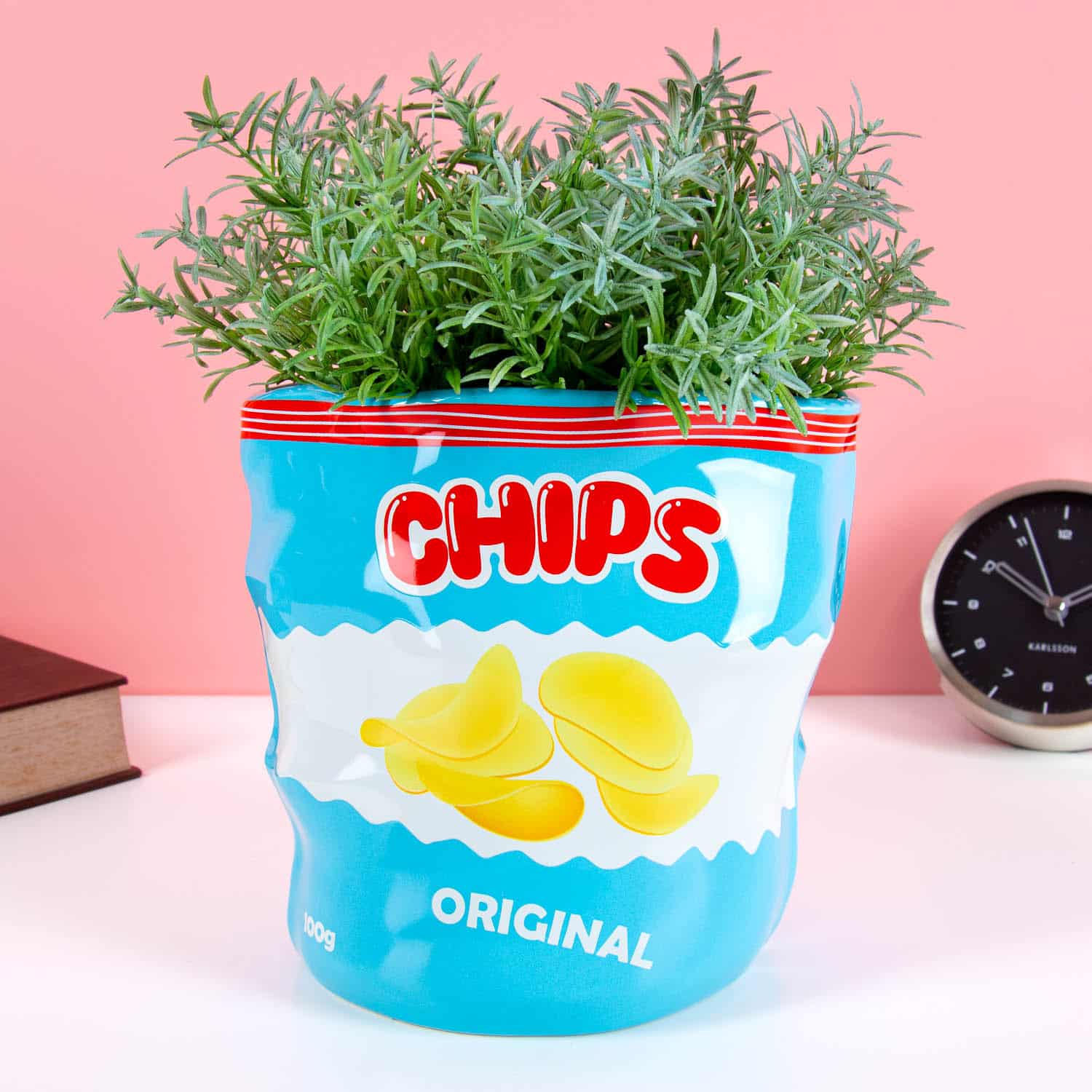 Liebst du originelle Wohnaccessoires? Oder gehörst du zu denen, die abends gerne eine Tüte Chips knabbern? Dann ist der Chips-Tüten-Blumentopf von Bitten genau das Richtige für dich! Dieser witzige Topf sieht aus wie eine Chipstüte, ist aber aus hochwertiger Keramik gefertigt. Schluss mit raschelnden Tüten auf dem Sofa – stattdessen kannst du ihn als Snackschale verwenden. Oder verwandle ihn in einen stilvollen Blumentopf für Küchenkräuter – ein echter Hingucker auf der Arbeitsplatte und zugleich praktisch.