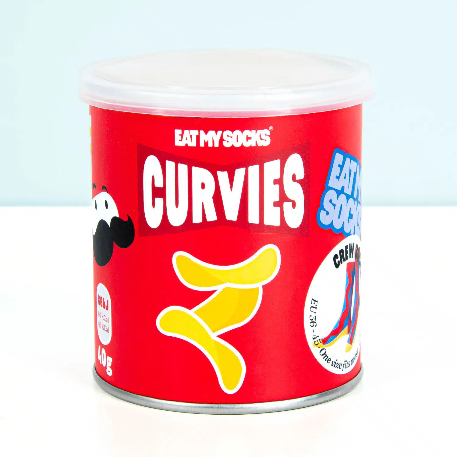 Sie sind gelb, gebogen und stecken in einer roten Röhre. Nein, wir sprechen nicht von Pringles! Es geht um die Curvies Chips-Socken von Eat My Socks, die natürlich von den berühmten Chips inspiriert sind. Die überraschenden Socken kommen in einer Chipsverpackung und sind in der Form den ovalen Chips nachempfunden. Das macht sie zu einem lustigen Geschenk – und einem, das man gerne bekommt!