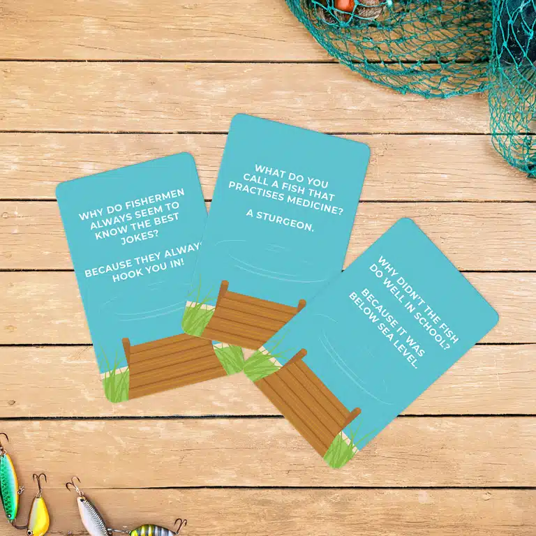 Get ready to scale new depths! Die Dad Jokes Angelausgabe von Gift Republic ist ein Set aus 100 Kärtchen mit den schlechtesten Angelwitzen, die du je gehört hast. Von “reel good” Wortspielen bis zu eye-roll-inducing One-Linern – diese Witze sind so schlecht, dass sie wieder gut sind. Perfekt am Angelteich, beim BBQ oder einfach auf dem WC. Ein urkomisches Geschenk für angelnde Väter und Wortwitz-Fanatiker!