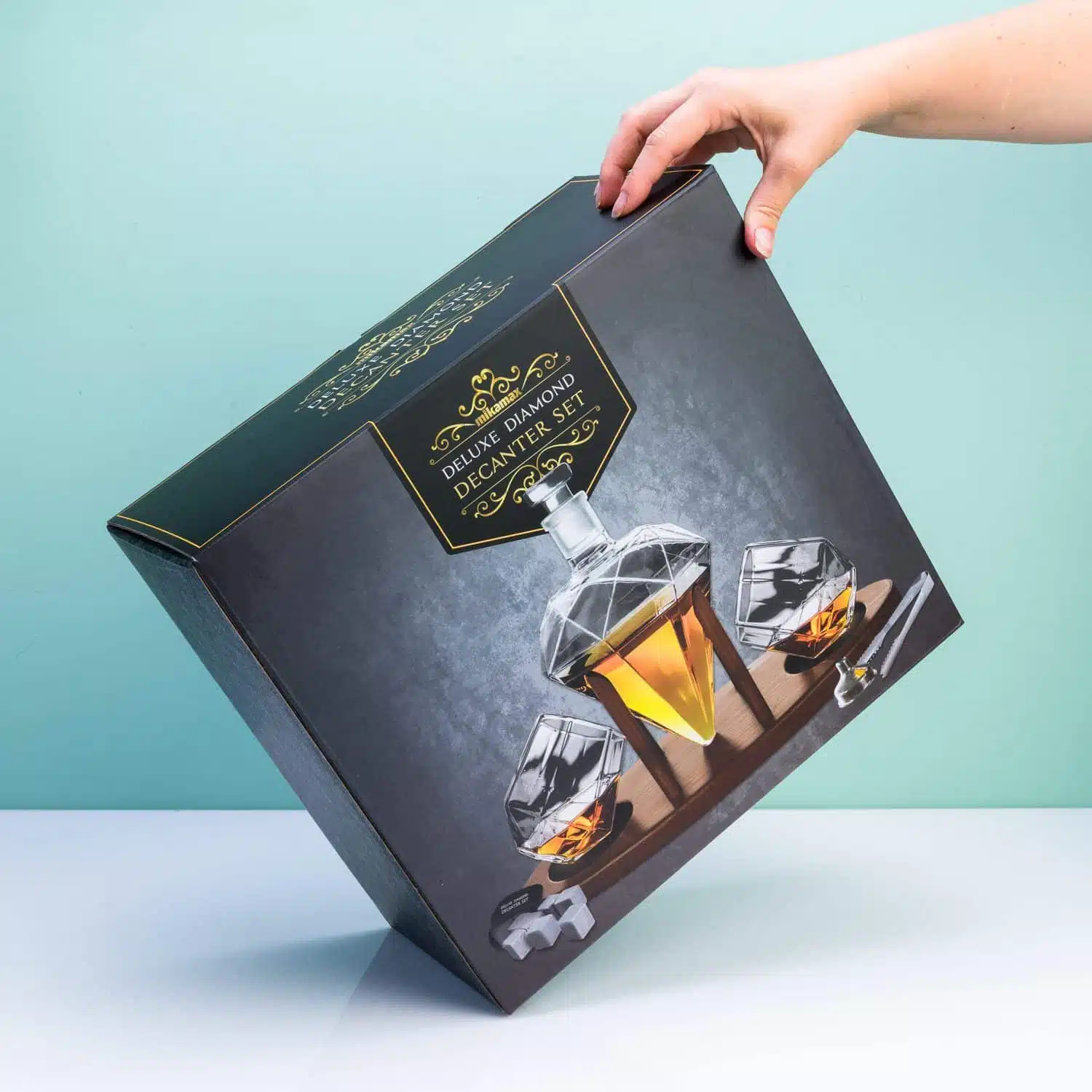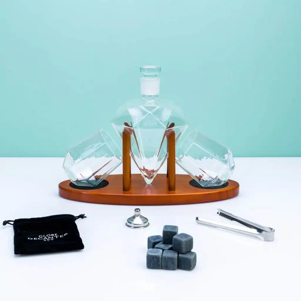 Bist du auf der Suche nach einem originellen Geschenk für jemanden, der die luxuriöse Erfahrung von Whiskey liebt? Die Diamant-Dekanter-Set Deluxe mit Gläsern von MikaMax ist ein wunderschönes Geschenk. Es ist perfekt als Weihnachtsgeschenk oder als Abschiedsgeschenk für jemanden, der in den Ruhestand geht. Das komplette Set besteht aus einem Whiskey-Dekanter in Form eines Diamanten, zwei passenden Gläsern und einem Holztablett mit Ständer für den Dekanter. Zusätzlich erhältst du ein Samtbeutelchen mit neun Whiskey-Steinen, die dein Getränk kühlen, ohne es zu verwässern, eine Eiszange und einen Trichter, um den Dekanter zu füllen.