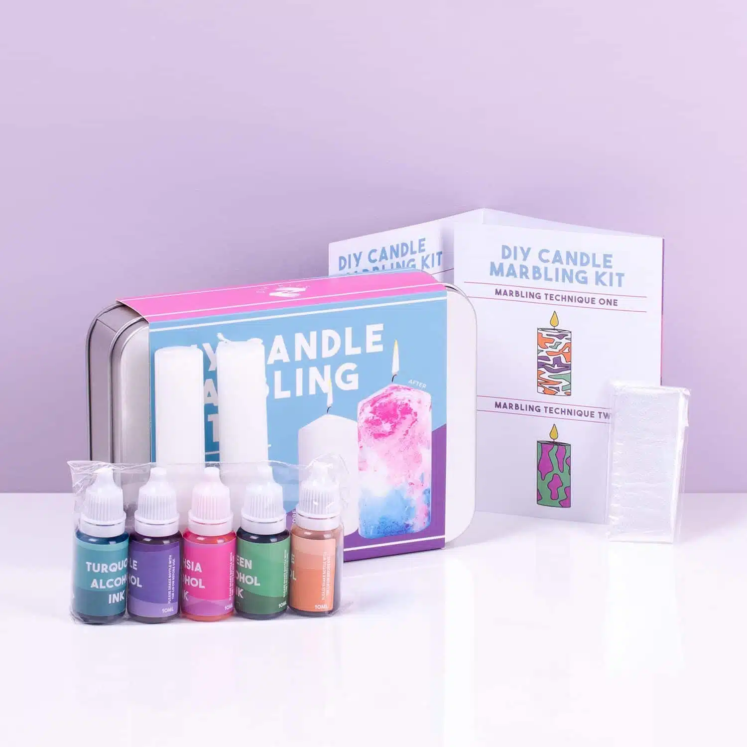 - Inhalt: fรผnf Farbtinten, zwei weiรe Kerzen und Anleitungen