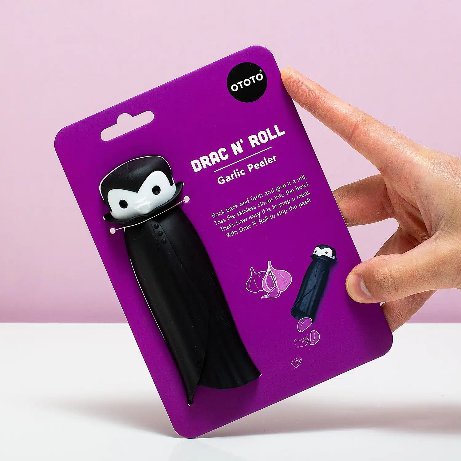 Knoblauch ist ein köstliches Gewürz für Gerichte. Nur der Geruch, der nach dem Schälen an den Händen bleibt: Joch! Mit dem Drac ‘n Roll Knoblauchschäler von Ototo schälen Sie diese scharfen Nelken schnell und effektiv. Der Knoblauchschäler besteht aus flexiblem Silikon und sieht aus wie Dracula.Aber dieser Vampir kann mit Knoblauch umgehen! Legen Sie die Nelken in seinen Mantel und rollen Sie den Sparschäler dann fest mit den Händen hin und her. Sie hören automatisch, wie sich die Schale von der Nelke löst. Drehen Sie es um und schütteln Sie es, und der frische Knoblauch rollt splitternackt heraus.