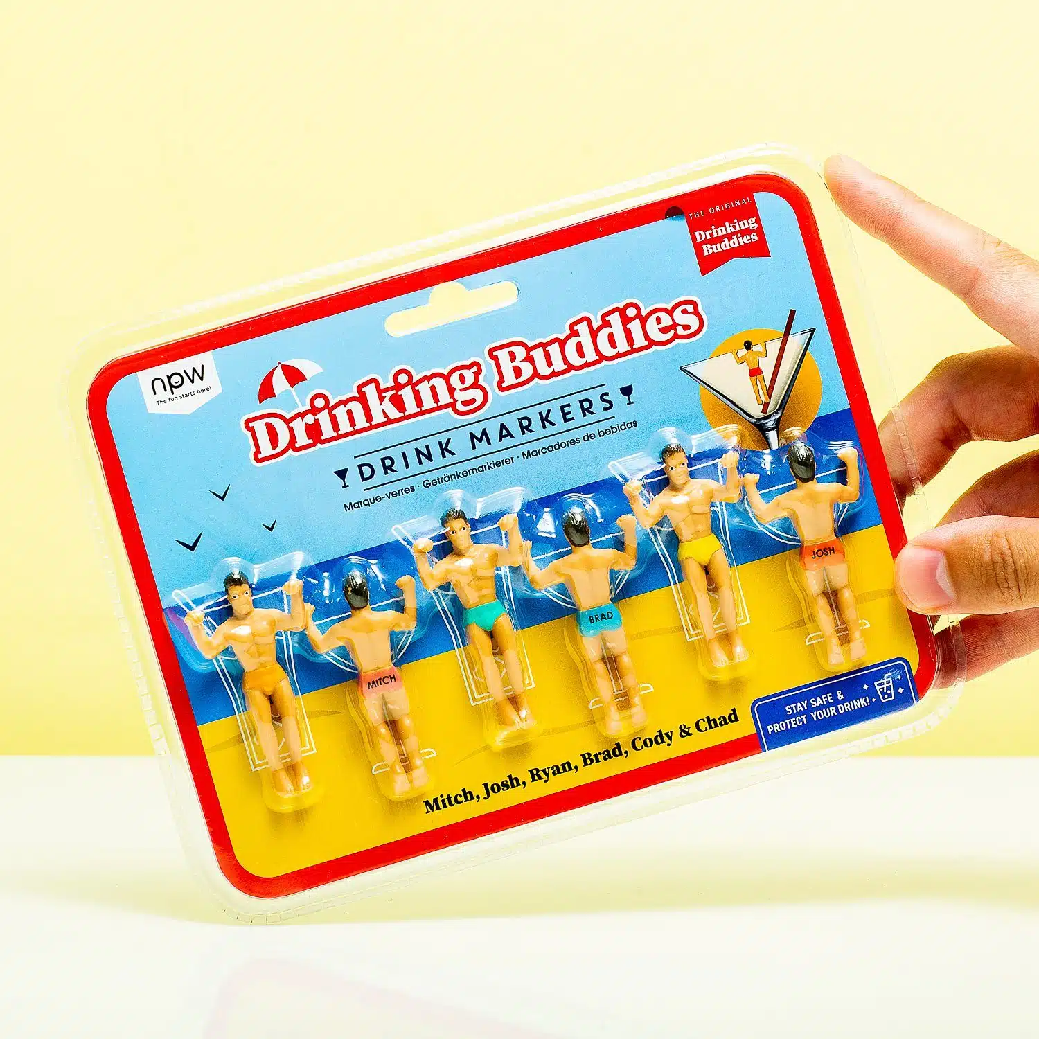 Genieรe einen sonnigen Cocktail, ohne aus Versehen aus den Glรคsern anderer zu trinken, mit den Drinking Buddies Glasmarkierern von NPW London. Du kannst zwischen einem Set mit Beach Boys oder Beach Babes wรคhlen. Diese frรถhlichen Mรคnner und Frauen in Badehosen und Bikinis stellen sicher, dass dein Getrรคnk auch wirklich deins bleibt. Die Badehosen und Bikinis haben alle unterschiedliche Farben und Namen, du musst dir nur deinen merken.