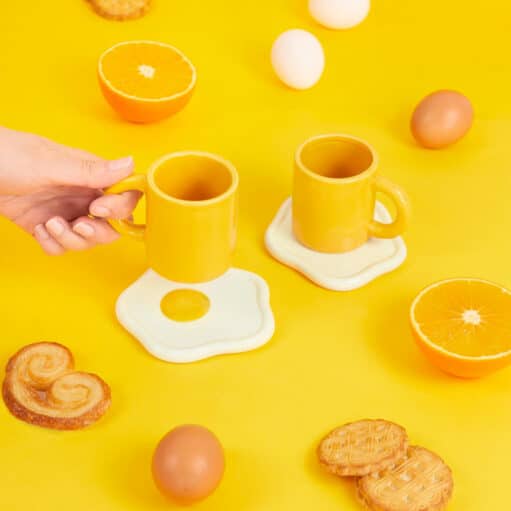 Sunny Side Up! Das Ei Tasse und Untertasse Set von Balvi ist ein Set aus zwei kleinen Kaffeetassen mit Untertassen in Form von Spiegeleiern. Die Tasse passt perfekt über das Eigelb und steht herrlich fröhlich auf deinem Esstisch. Das Set ist perfekt als Geschenk für Menschen, die gerne ein Spiegelei essen, für den Osterbrunch oder einfach weil du originelle Küchenaccessoires liebst.