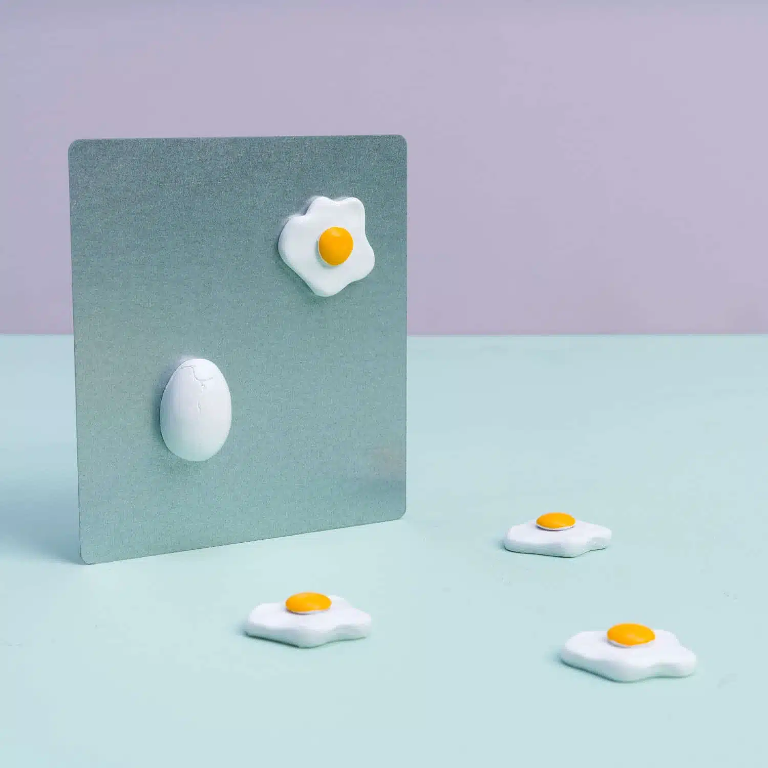 Von nun an werden Sie nie mehr vergessen, Eier zu kaufen. Ihr Kühlschrank ist voll davon. Mit den Egg-Magneten (5er-Set) von Trendform lässt sich eine Einkaufsliste oder eine Kinderzeichnung spielerisch aufhängen. Das Set enthält ein ganzes Ei mit aufgebrochener Schale und vier Spiegeleier. Perfekt für die Küche, aber auch an anderen Orten super lustig.