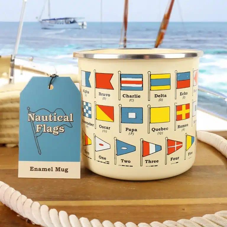 Trรคumst du vom Meer am Schreibtisch? Dann ist dieser Emaille-Becher mit nautischen Flaggen von Gift Republic deine Rettung. Der Emaille-Becher ist mit bunten nautischen Flaggen verziert, perfekt fรผr Segler und alle anderen, die gerne auf dem Wasser unterwegs sind. Dieser robuste Becher ist langlebig und nahezu unzerbrechlich: ideal fรผrs Camping, Segeln oder einfach zuhause.