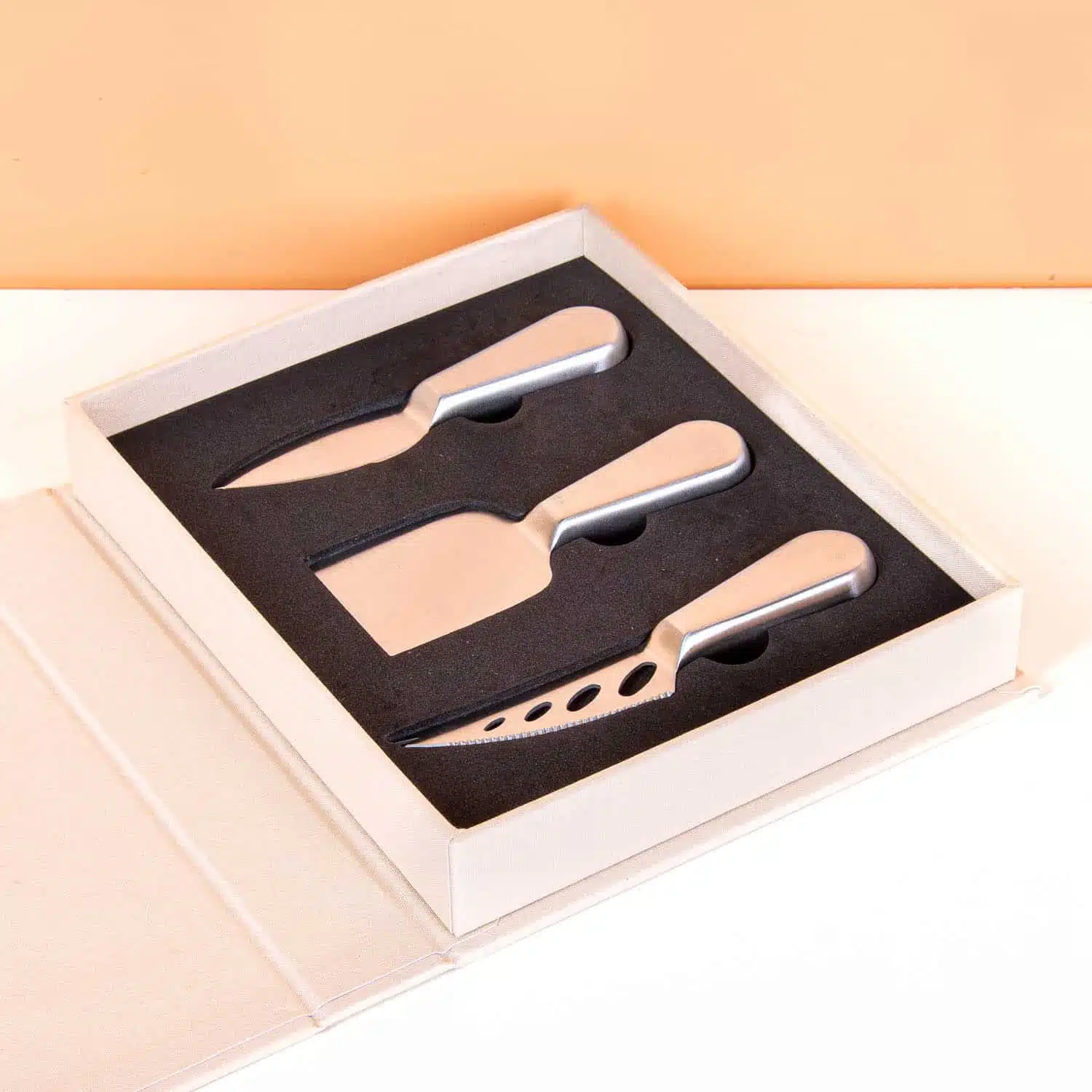 Das Essentials Buch mit Käse-Werkzeugen von Printworks ist ein Komplettset Käsemesser, schick verpackt in Buchform. Öffnest du das Buch, findest du drei verschiedene Messer: ein gezahntes Messer für weiche Käsesorten wie Brie, ein Messer für bröckelige Käse wie Blauschimmelkäse, und ein vielseitiges Messer für harte Käse wie Parmesan. Wenn du es nicht benutzt, steht es wunderschön zwischen deinen Kochbüchern. Dieses Set ist perfekt für den Aperitif, Weinproben oder einfach einen gemütlichen Käseabend auf der Couch. Ideales Weihnachtsgeschenk für Käseliebhaber!