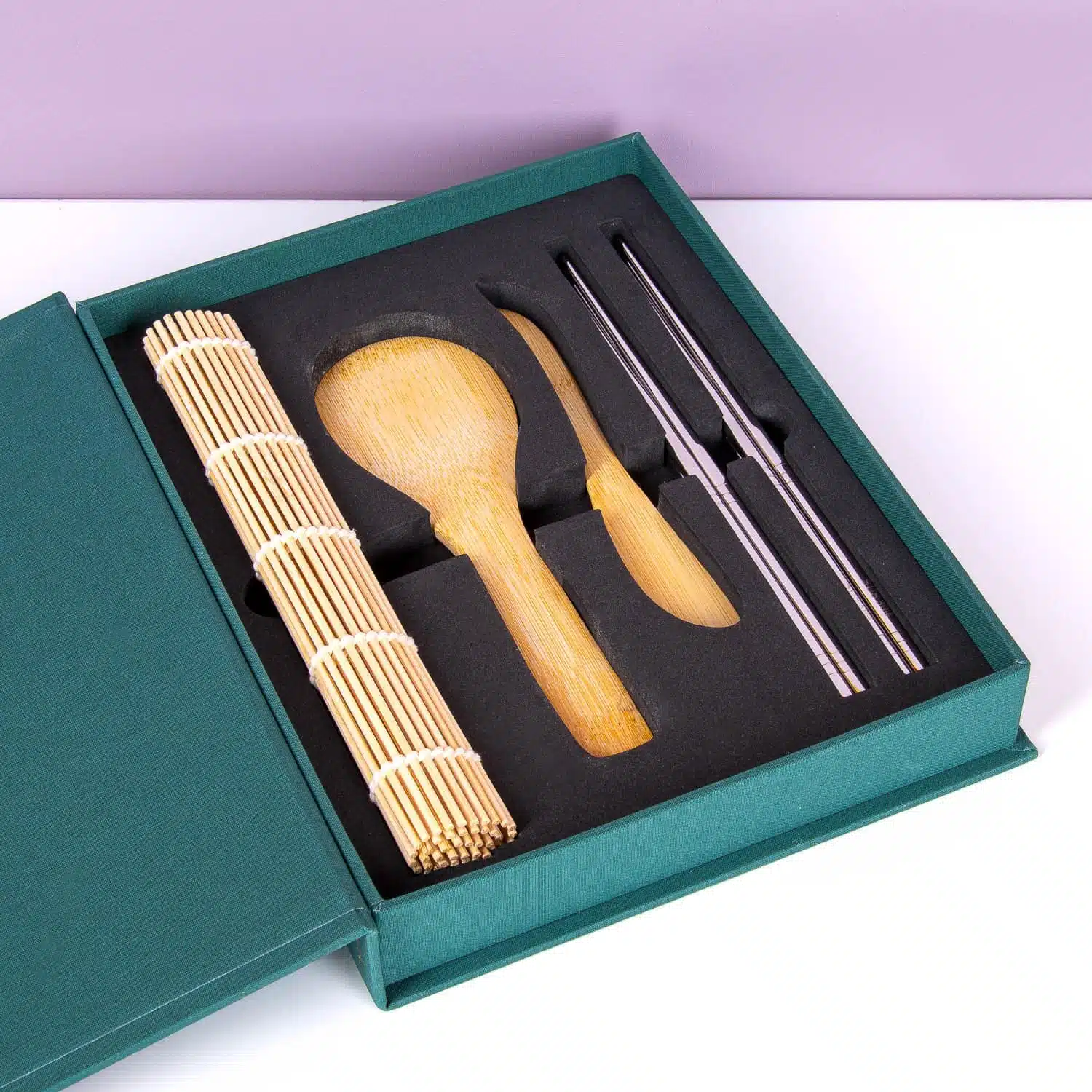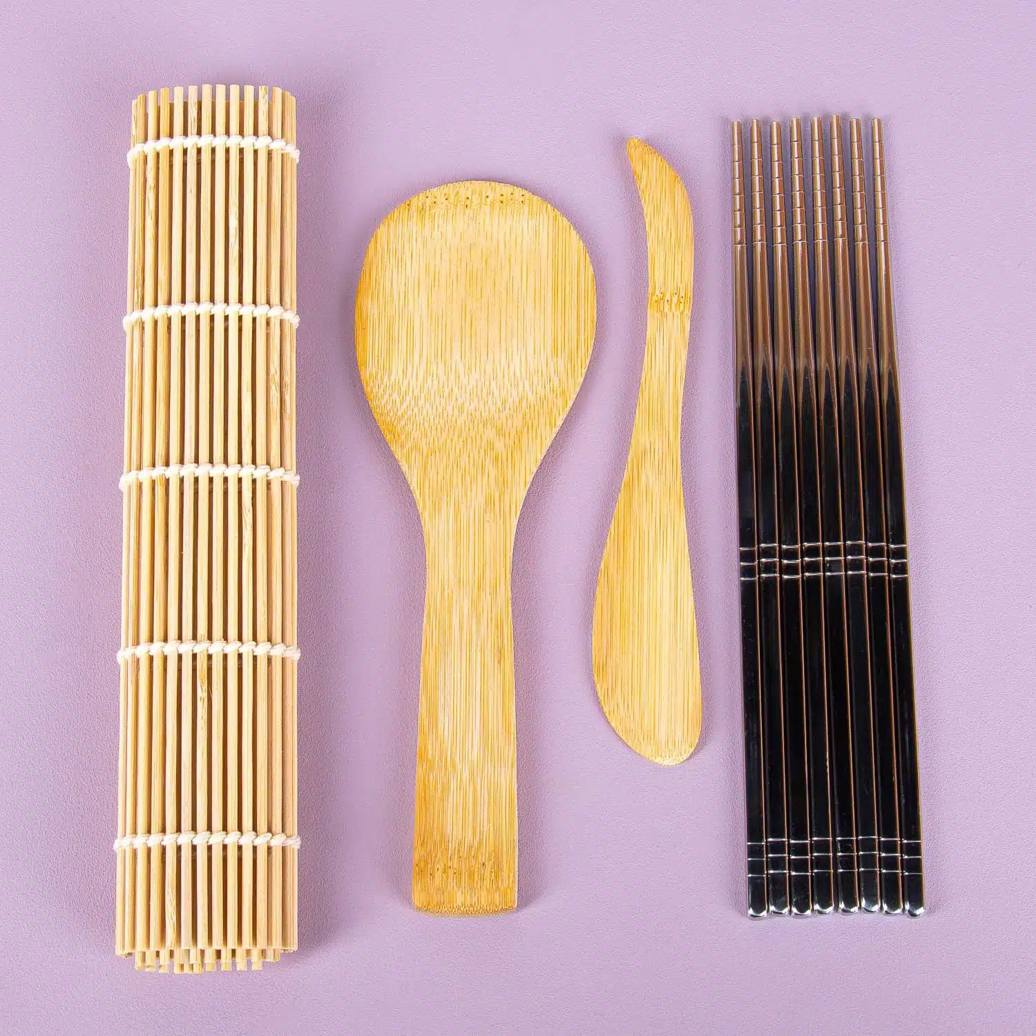 - Mit Paddel, Streichmesser und Rollmatte (alles Bambus) und 8 Essstรคbchen aus Edelstahl