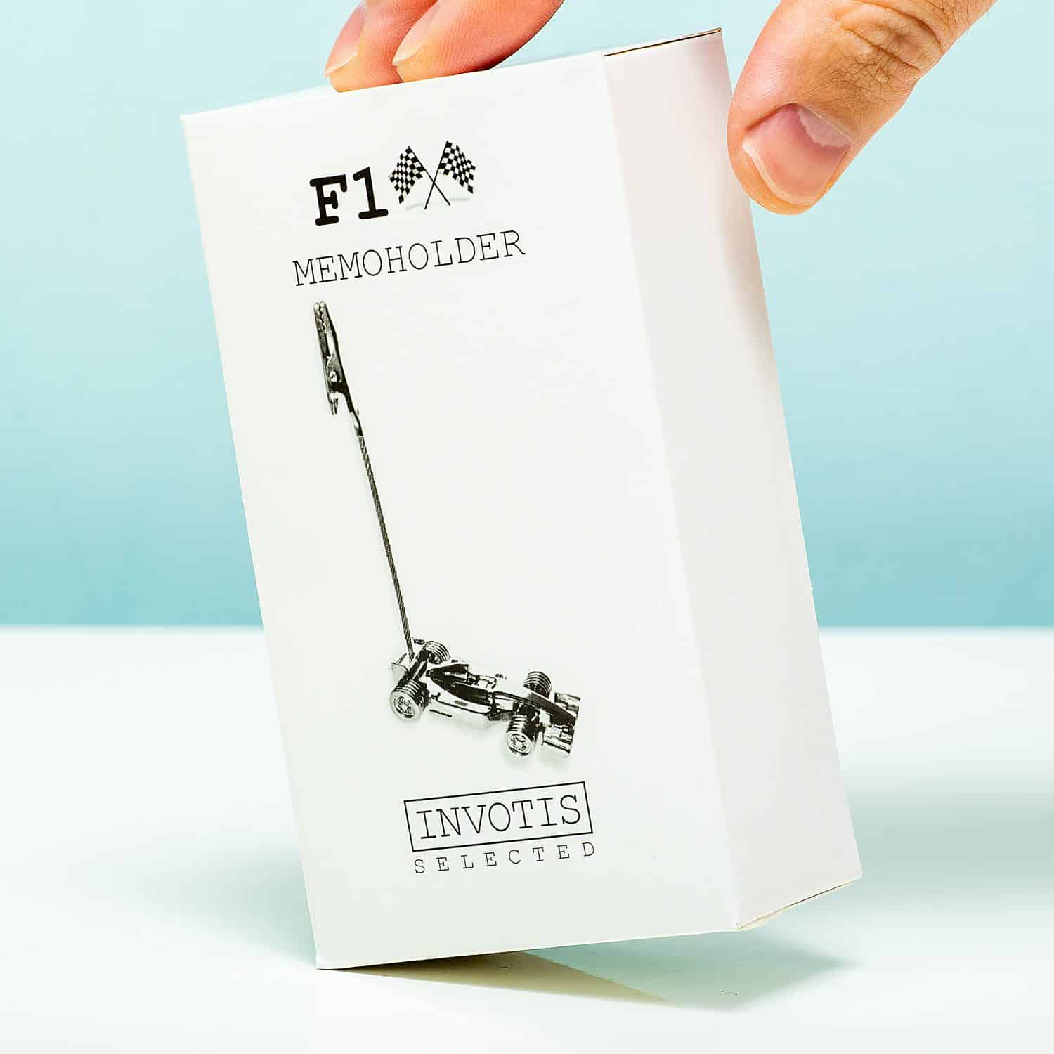 Brauchst du ein originelles Geschenk fรผr einen Rennsportfan, aber eine Fahrt in einem echten Rennwagen ist dir zu viel? Dann wรคhle den F1 Memohalter von Invotis! Dieser lustige Memohalter hat an der Unterseite einen Rennwagen. Mit der Klammer kannst du einen Zettel oder ein Foto festhalten. Zum Beispiel eine Einkaufsliste oder den Rennkalender fรผr die kommende Saison.