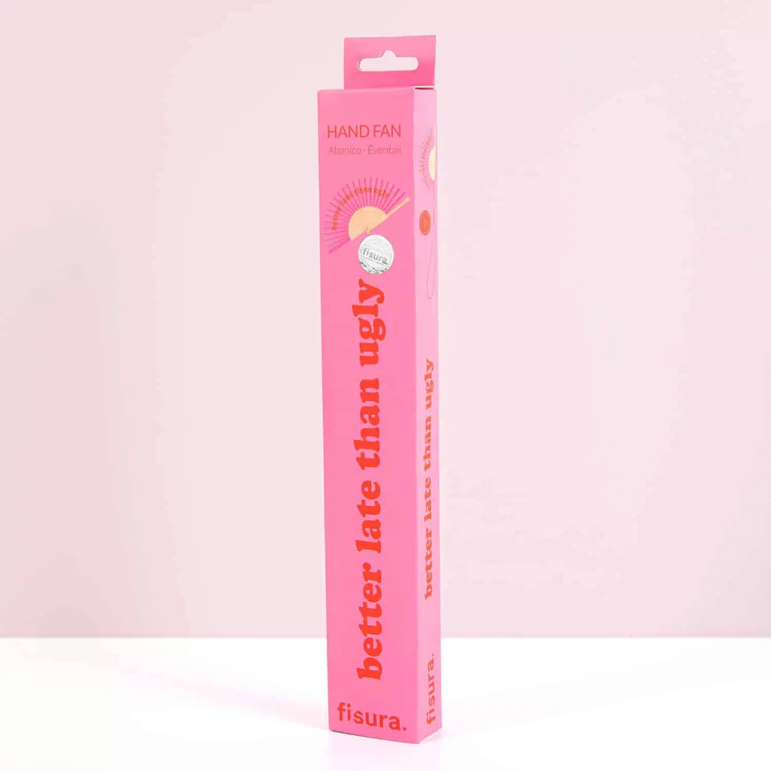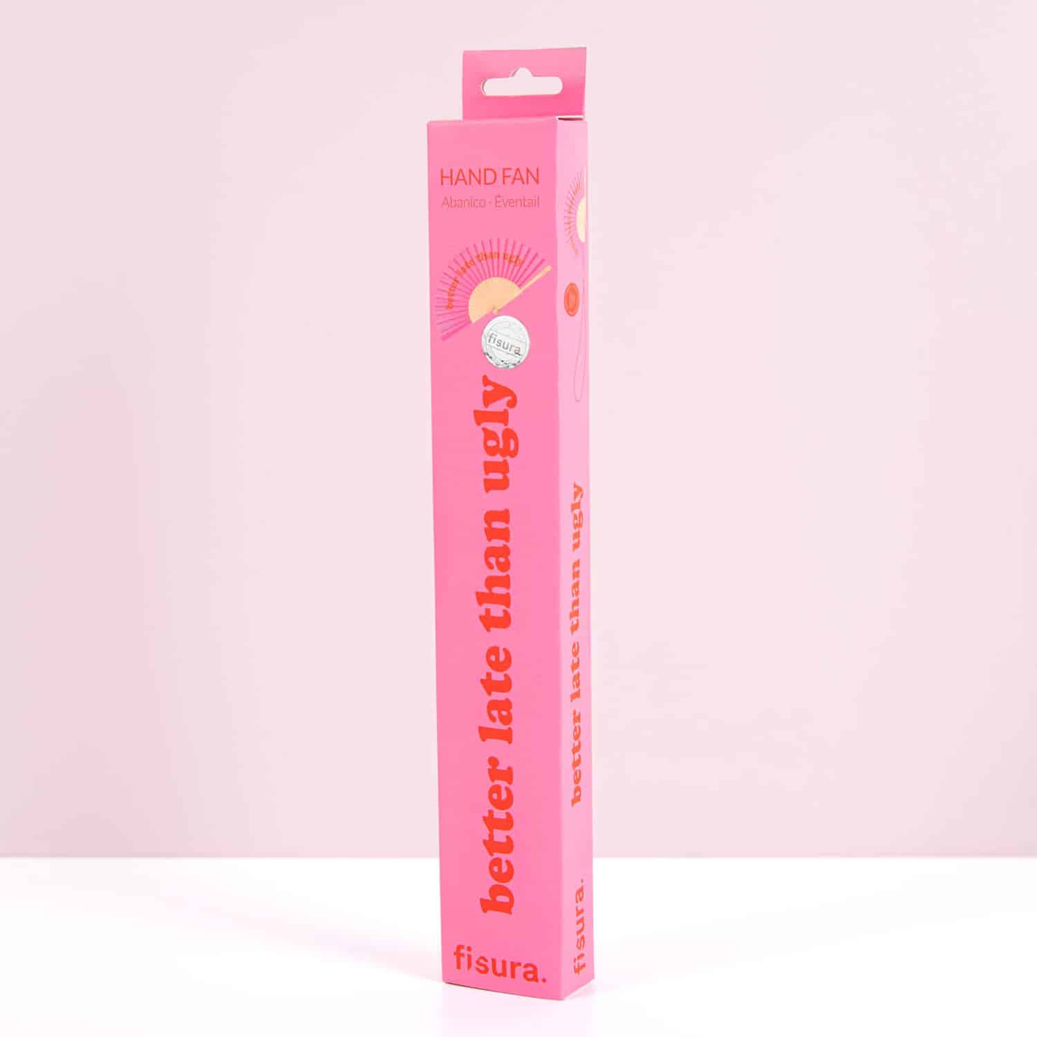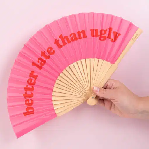 - Pinkfarbener Fächer mit dem Text: Better Late Than Ugly