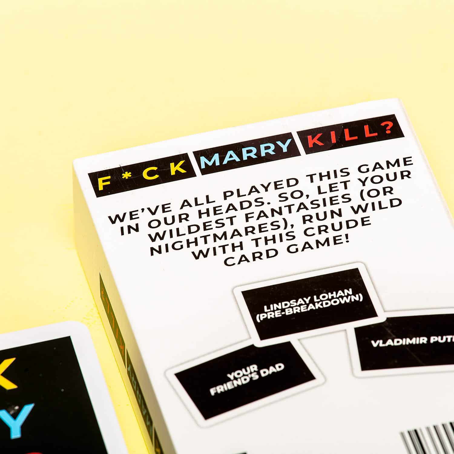 Du ziehst drei Karten mit Namen von Personen und musst dann entscheiden: Fck, Marry oder Kill? Das Fck, Marry, Kill Spiel von Gift Republic ist urkomisch aufgrund der schwierigen Entscheidungen, die du treffen musst. Mรถchtest du mit Bob Ross ins Bett gehen? Nein? Dann musst du dich zwischen Homer Simpson oder der Oma deines Freundes entscheiden! Das perfekte Geschenk fรผr Studenten, fรผr den Freundeskreis und fรผr den Urlaub.
