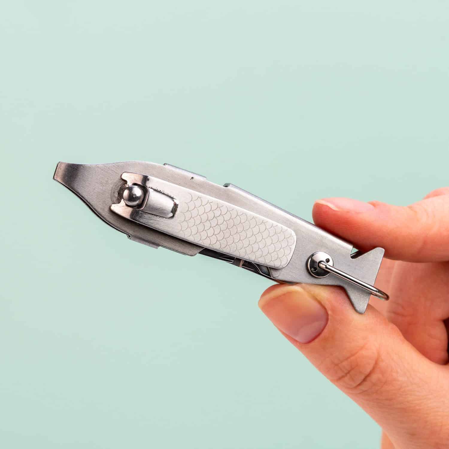 Kann ein Fisch hilfreich sein? Ja, wenn es sich um das Fisch Multitool von Kikkerland handelt. Dieses kompakte Multitool enthรคlt ganze neun verschiedene Werkzeuge, die du beim Angeln oder im Alltag nutzen kannst. Du kannst damit beispielsweise deine Nรคgel schneiden, einen Schlรผsselring รถffnen und Schrauben festziehen. Darรผber hinaus enthรคlt das Multitool eine Schere, ein Messer, einen Knotentag Crimper und ein Werkzeug zum Reinigen deiner Haken. Und das alles an einem praktischen Ring, mit dem du es an deinem Schlรผsselbund befestigen kannst.