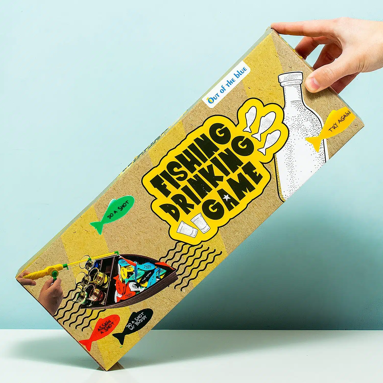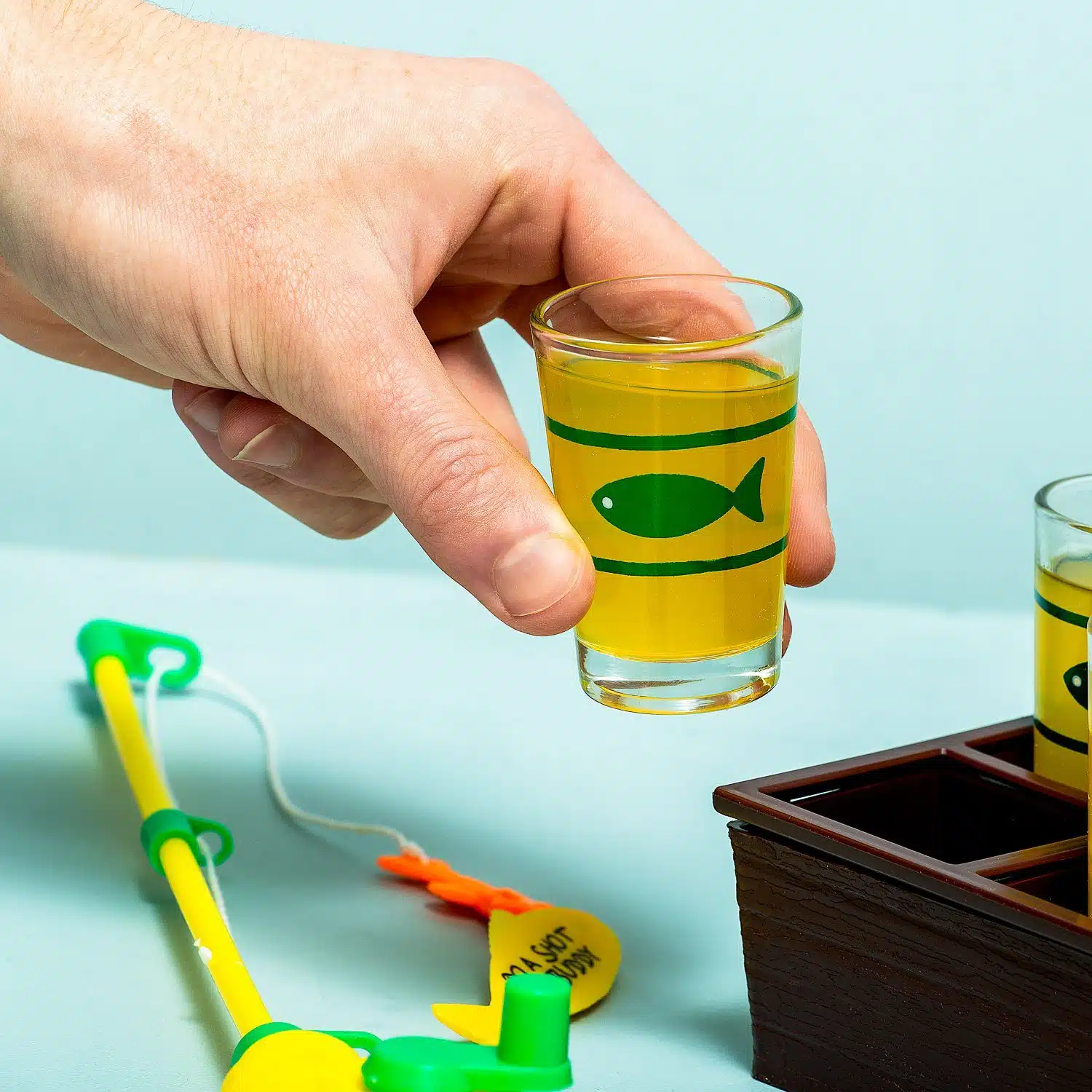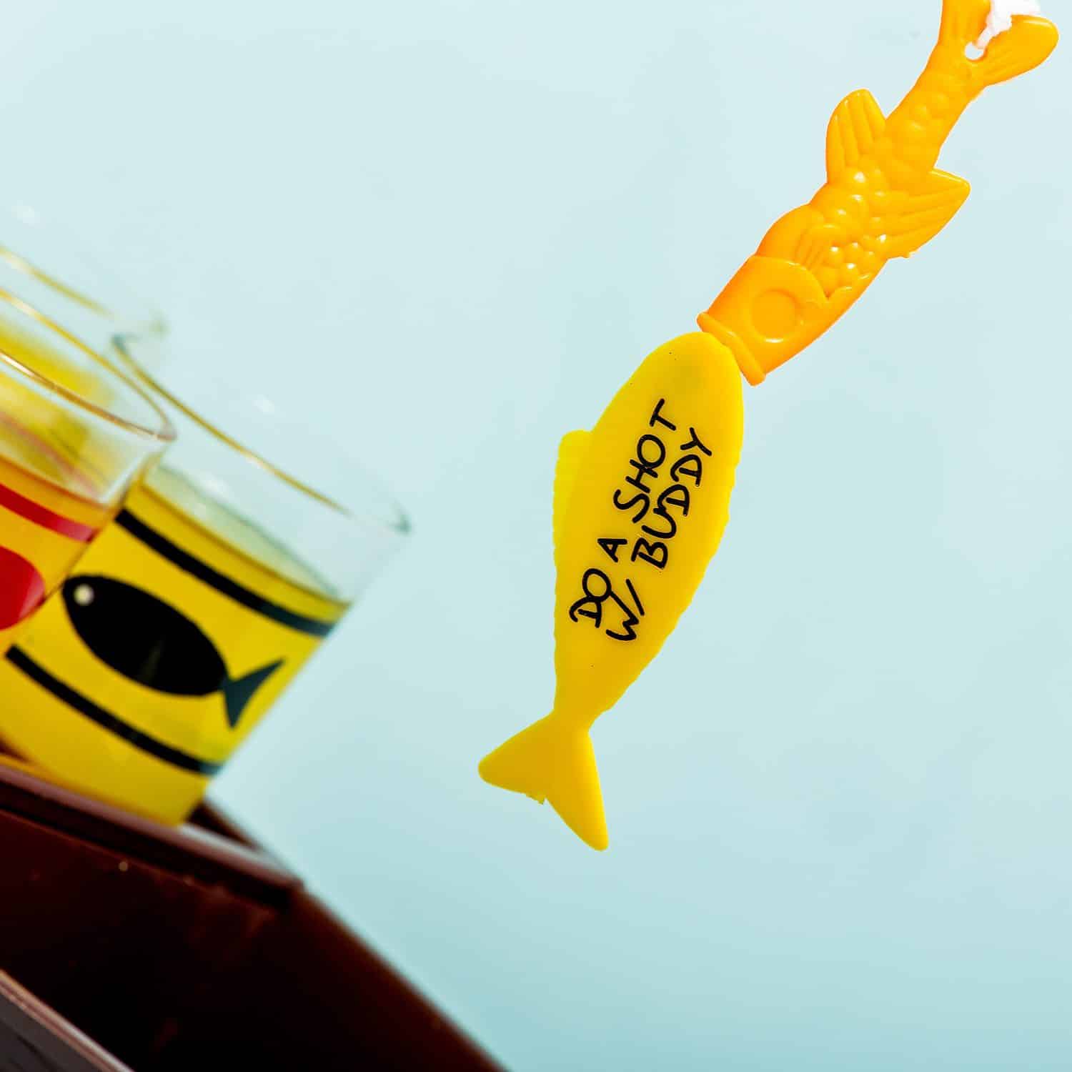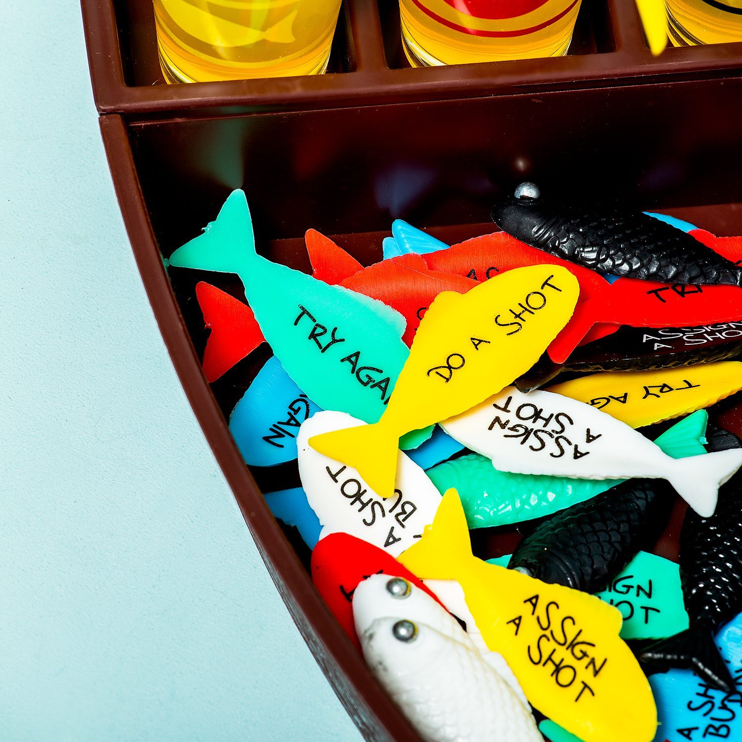 Sie möchten in Ihrer Freizeit entspannt fischen? Noch mehr Spaß macht das mit dem Fisch-Trinkspiel mit Schnapsgläsern von Out of the Blue! Dieses Trinkspiel können Sie zu sechst spielen: Angeln Sie abwechselnd einen Fisch vom Boot aus. Auf der Rückseite befindet sich eine Aufgabe, die Sie erfüllen müssen.Das Paket enthält ein Boot, sechs Schnapsgläser, eine Angelrute und verschiedenfarbige Fische