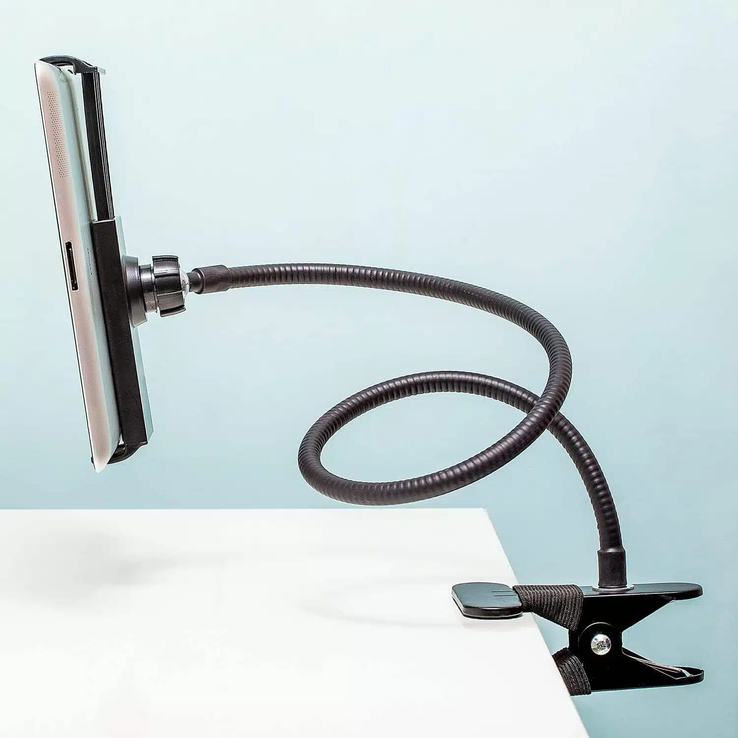 Drehst du dich auch immer im Bett herum, auf der Suche nach der perfekten Haltung, um dein Tablet zu halten? Nach fรผnf Minuten bekommt man oft schon einen mรผden Arm, wenn man ein Video auf dem Tablet schaut. Mit dem flexiblen Tablethalter von Kikkerland ist das kein Problem mehr. Dieser Halter kann mit einer Klemme an einem Bett oder Tisch befestigt werden. Dann biegst du den flexiblen Arm so, dass er die perfekte Position fรผr dich hat.