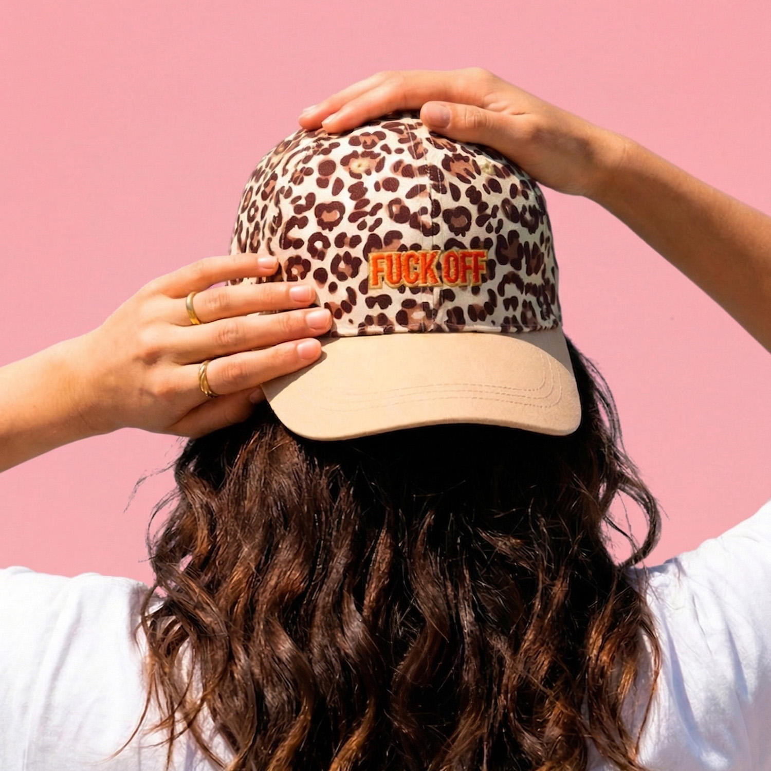 Manchmal braucht man einfach eine Mรผtze, die es fรผr einen sagt. Die Fuck Off Cap von Fisura ist die perfekte Festival-Mรผtze, das ultimative Strand-Accessoire oder das klarste Urlaubs-Statement. Mit Leopardenprint und dem Text FUCK OFF. Subtil? Nein. Witzig? Absolut.