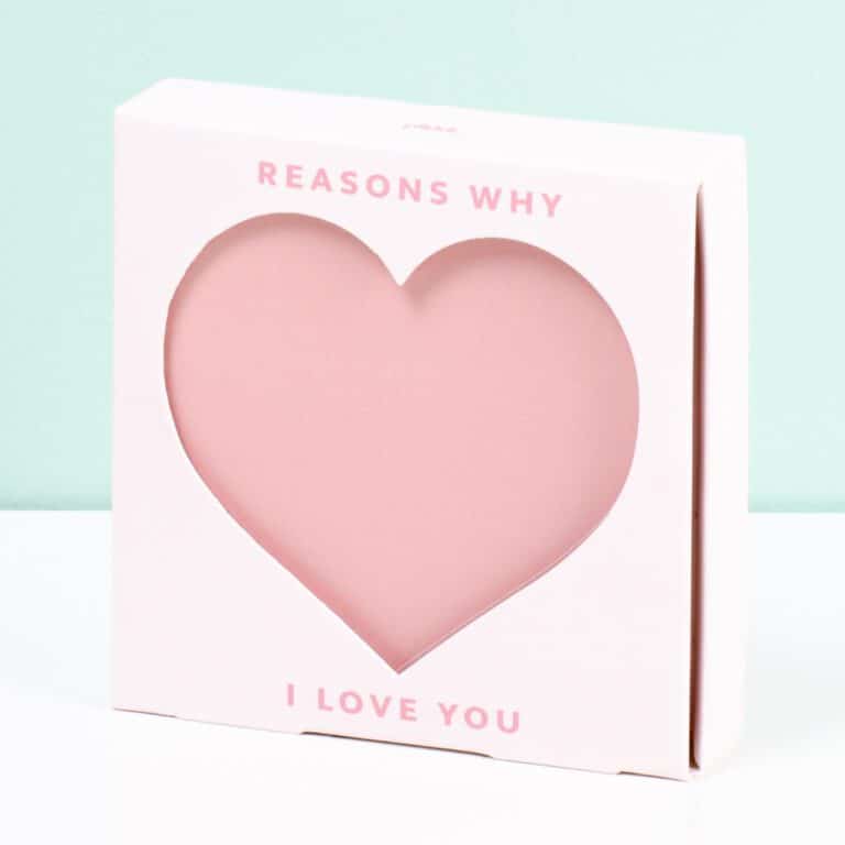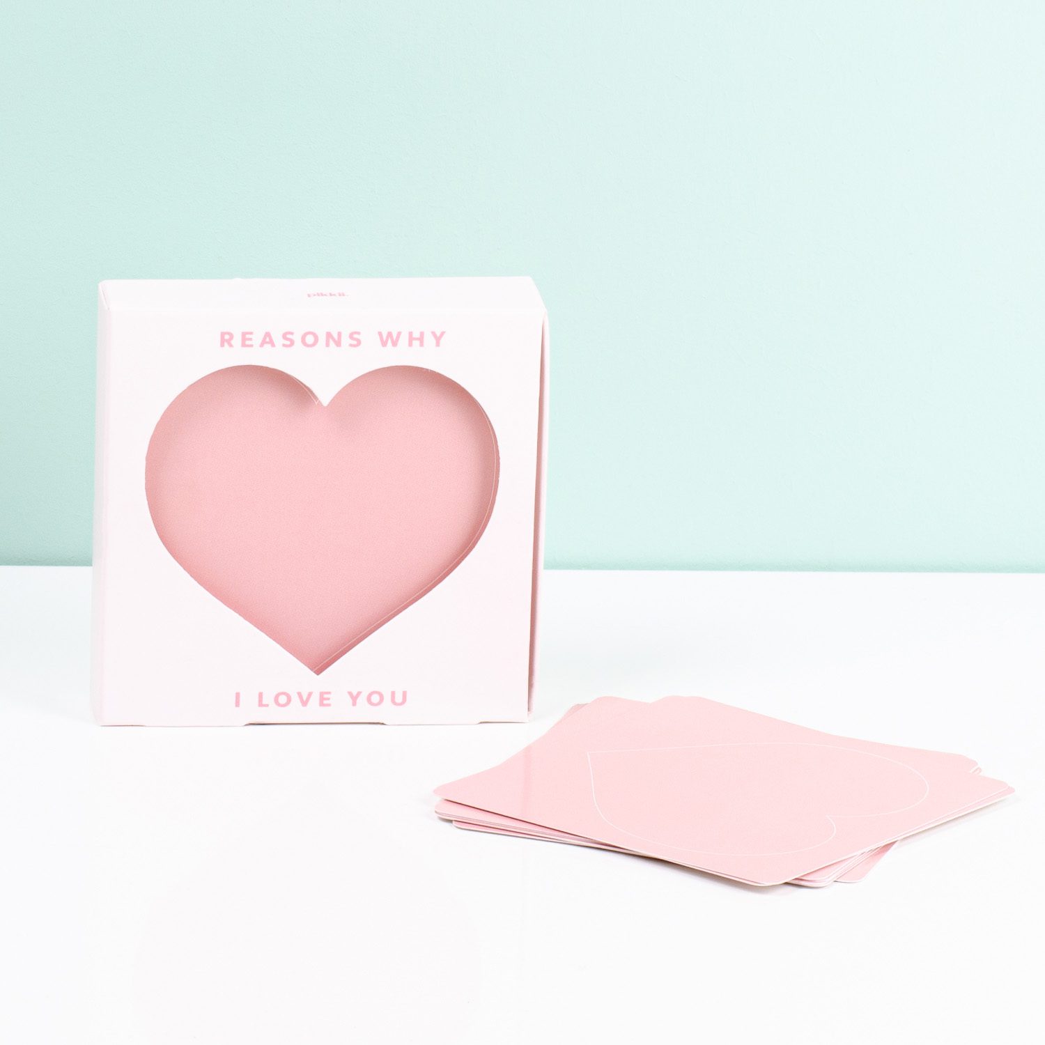 Ob du deinen Partner nun einen Heiratsantrag machen möchtest, etwas Originelles zum Valentinstag schenken willst oder einfach eine Möglichkeit suchst, deine Gefühle auszudrücken: Fünfzig Gründe, warum ich dich liebe von Pikkii hilft dir dabei. In dieser Schachtel, mit einem ausgeschnittenen Herz, befinden sich fünfzig leere Karten. Darauf schreibst du alle Gründe, warum du die andere Person so sehr liebst. Auch sehr schön, um deinen Kindern Komplimente zu machen.