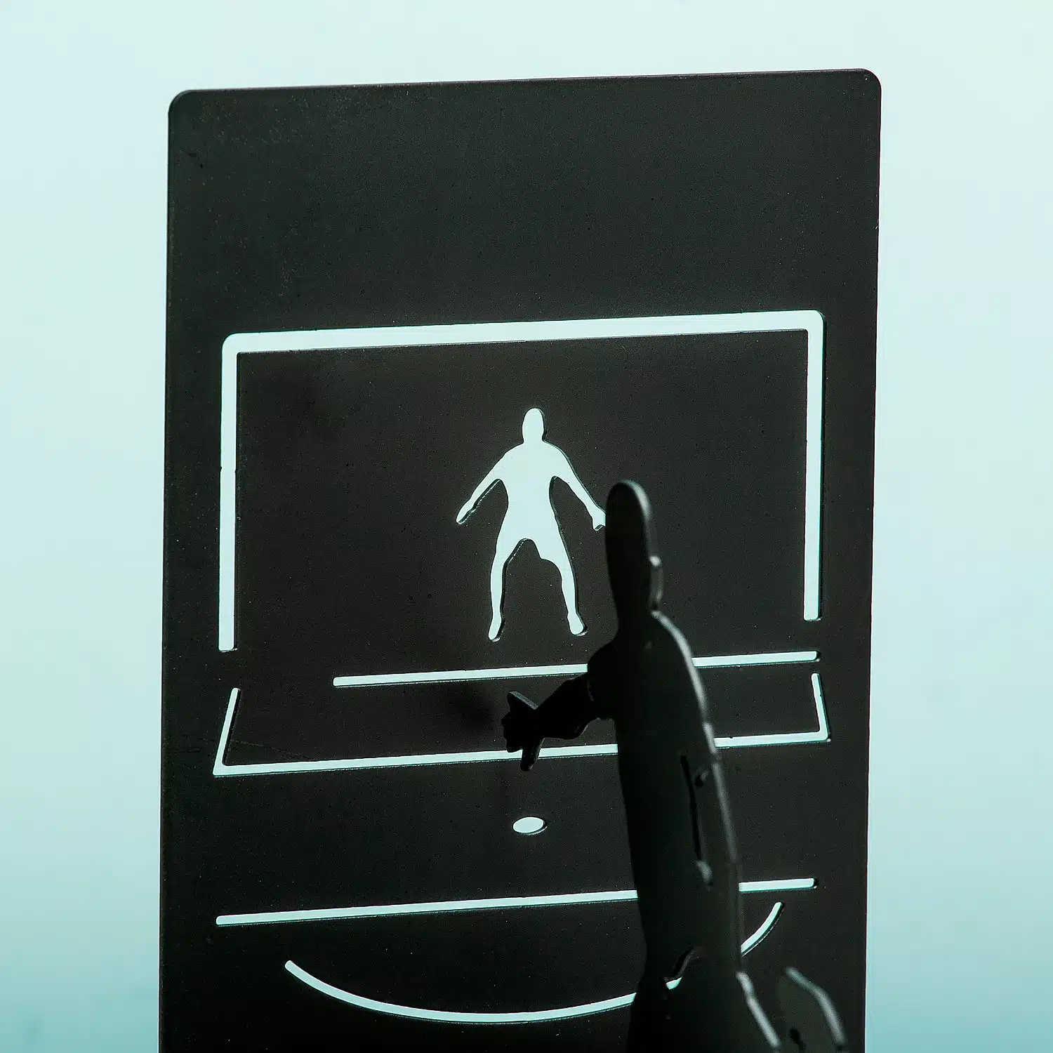 - Auf der Buchstütze ist ein Tor mit Torhüter