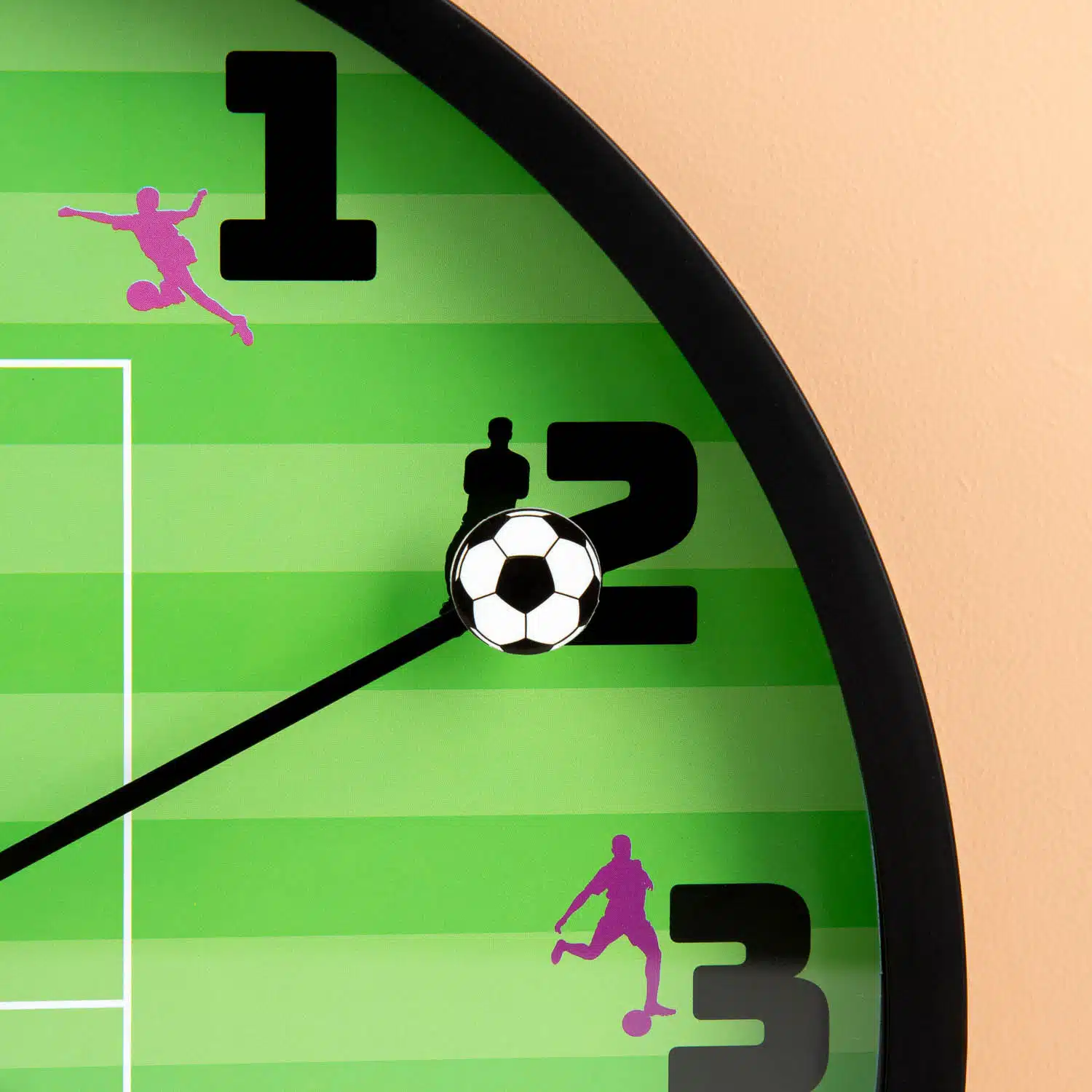 Für jedes Kind, das von einer Profikarriere träumt oder einfach Fußball liebt, gibt es die Fußball-Uhr! Diese fröhliche Wanduhr zeigt im Hintergrund ein Fußballfeld, hat eine Fußballfigur auf dem großen Zeiger und kleine Spieler auf den Zeigern. Mit dieser Uhr an der Wand schläft es sich noch besser ein – schließlich kann man nur von seiner Fußballkarriere träumen!