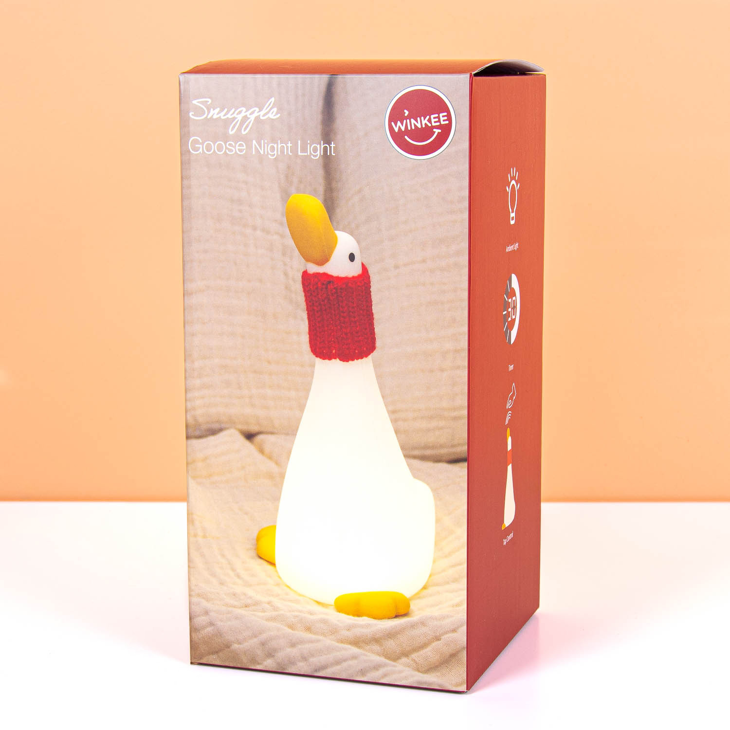 Das Gans-Nachtlicht von Winkee hรคlt im Kinderzimmer Wacht. Diese niedliche Silikon-Gans hat einen herrlich warmen Schal um und strahlt sanftes Licht ins Kinderzimmer. Das Silikon-Nachtlicht hat drei Lichtmodussen und einen optionalen 30-Minuten-Timer, damit es automatisch ausschaltet, wenn dein Kleines schlรคft. Groร genug, um aufzufallen โ sanft genug, um nicht zu stรถren.