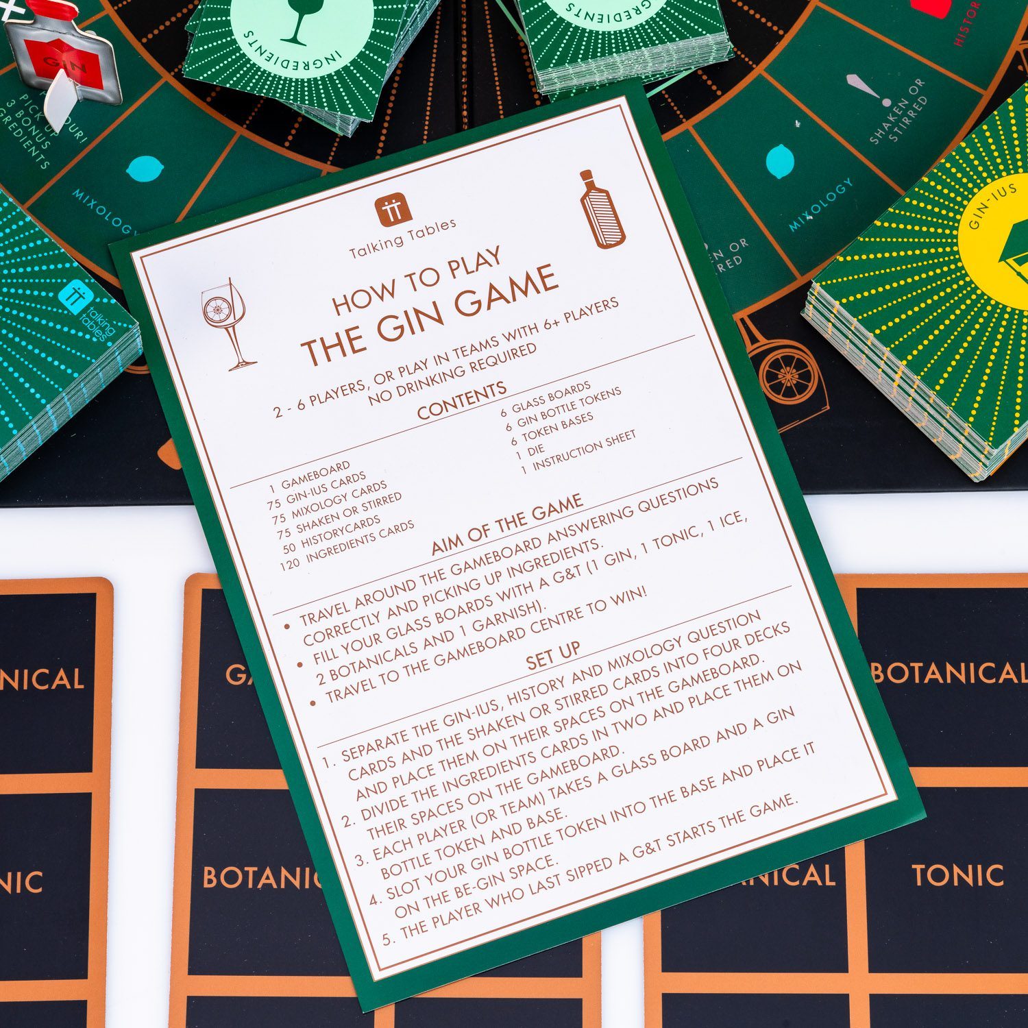 Gib die richtige Antwort, um alle benรถtigten Zutaten fรผr deinen Gin Tonic zu sammeln, und versuche dann, so schnell wie mรถglich ins Zentrum zu gelangen. Das ist kurz die Spielbeschreibung des Gin Brettspiels von Talking Tables. Dieses originelle Brettspiel ist speziell fรผr Gin-Liebhaber entworfen. Du beantwortest Fragen รผber dein Lieblingsgetrรคnk und sammelst so Zutaten, aber du weiรt nie, was unterwegs passiert. Bevor du dich versiehst, verlierst du einige der Zutaten oder musst eine Runde aussetzen. Ein originelles Spiel fรผr alle, die Gin lieben.