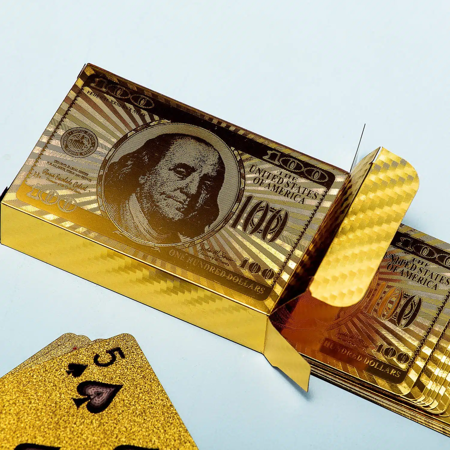 Möchtest du Karten spielen mit einem Hauch von Luxus? Mit diesem goldenen Kartenspiel von Invotis fühlst du dich, als würdest du an den luxuriösen Spieltischen eines Casinos in Las Vegas sitzen. Dieses Kartenspiel ist nicht nur goldfarben, sondern hat auch das Aussehen einer 100-Dollar-Note. Für den Fall, dass es noch nicht luxuriös genug ist. Ob Blackjack, Mau-Mau oder Herzjagen – mit diesem goldfarbenen Kartenspiel wird alles ein Stück eleganter.