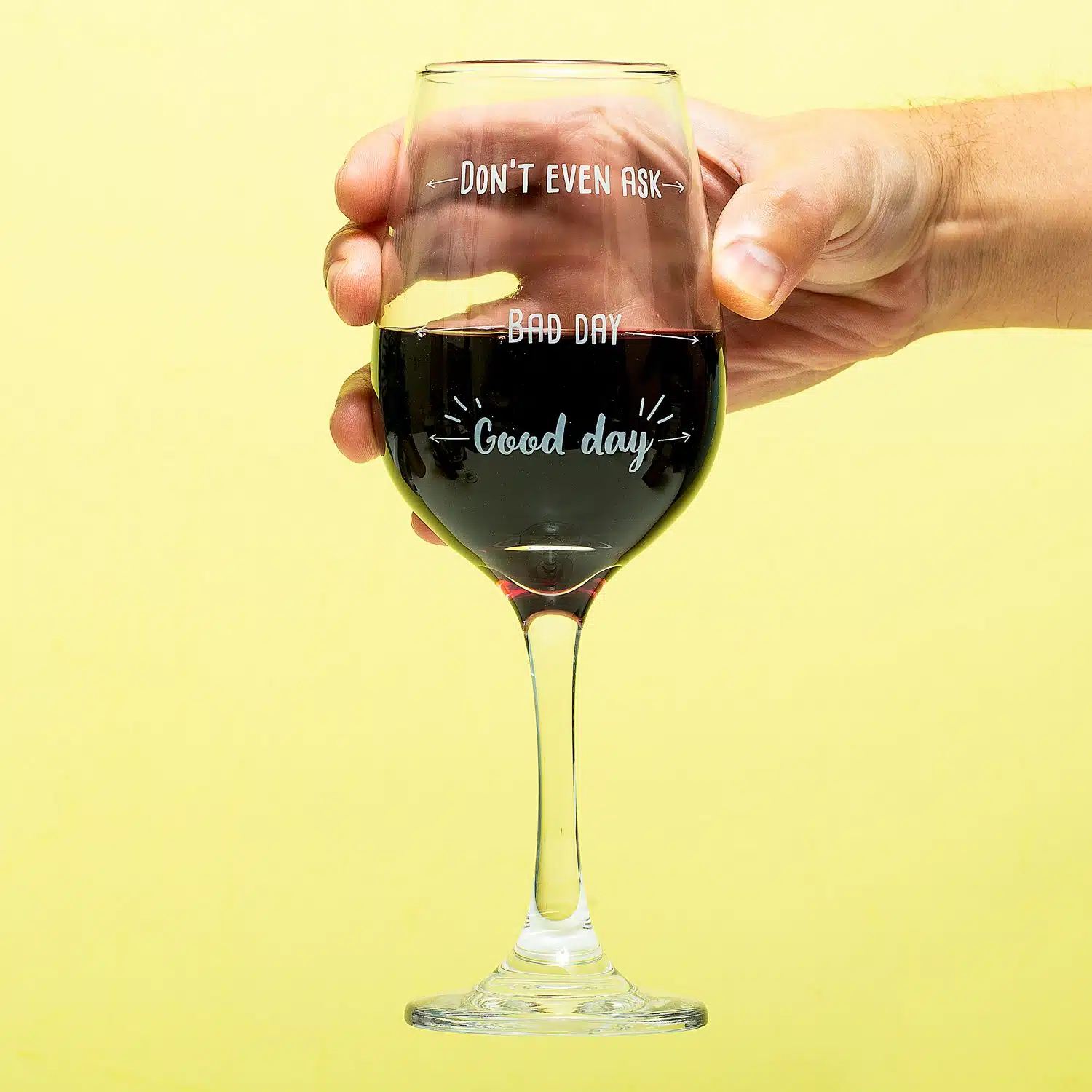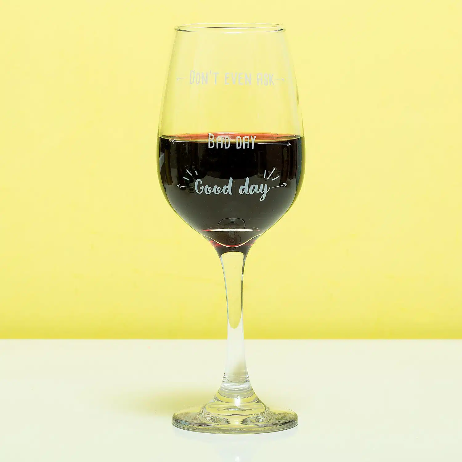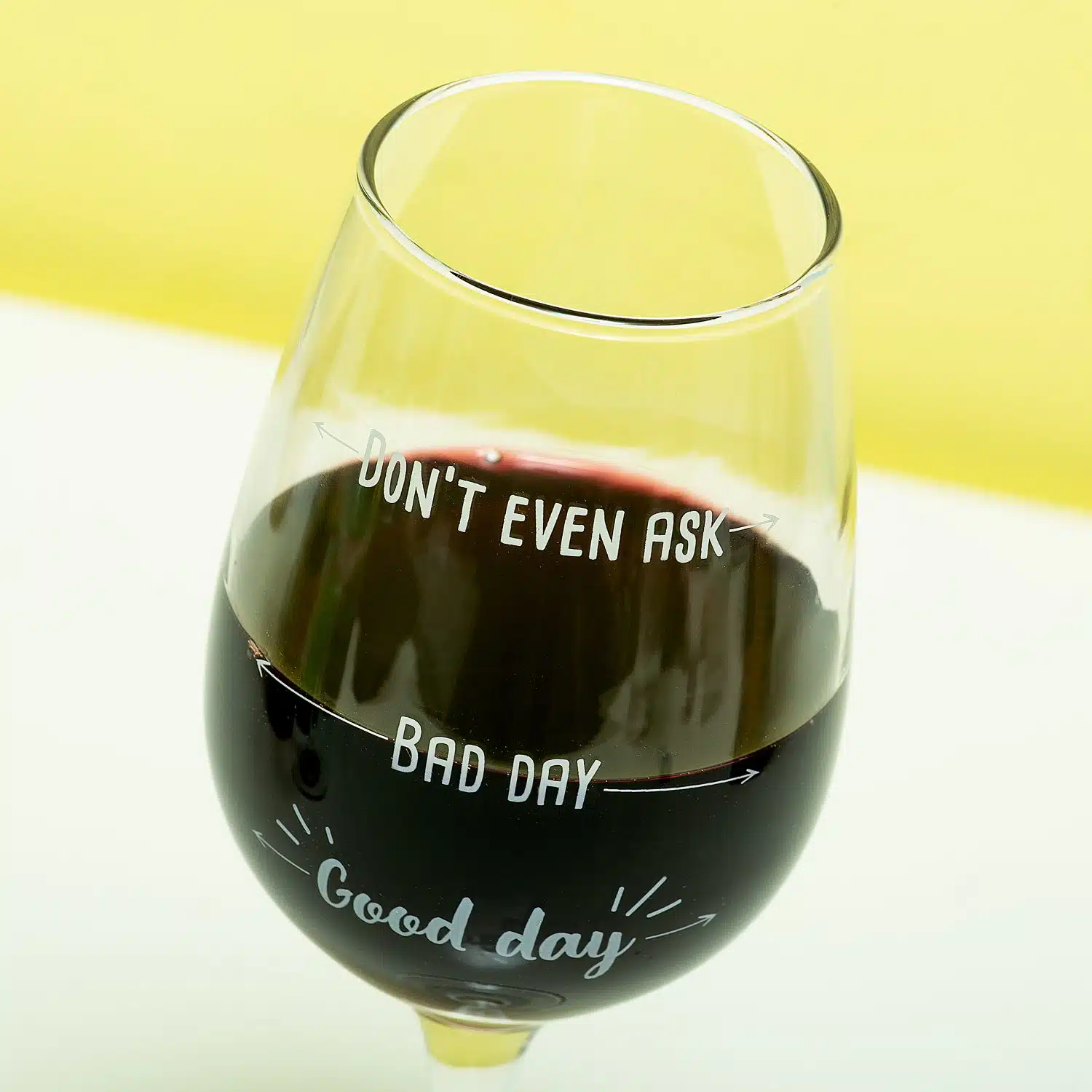 War es ein guter Tag, ein schlechter Tag oder soll ich gar nicht erst fragen? Ihre Mitbewohner können Ihre Stimmung leicht aus dem Weinglas Good Day Bad Day von Out of the Blue ablesen. Auf dem Glas stehen die Worte: Guten Tag, schlechten Tag und nicht einmal fragen. Sie füllen das Glas so voll, wie es Ihrer Stimmung entspricht.