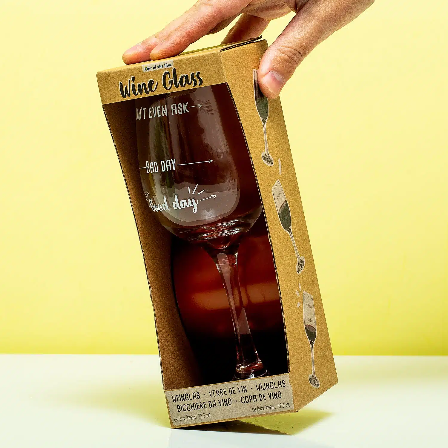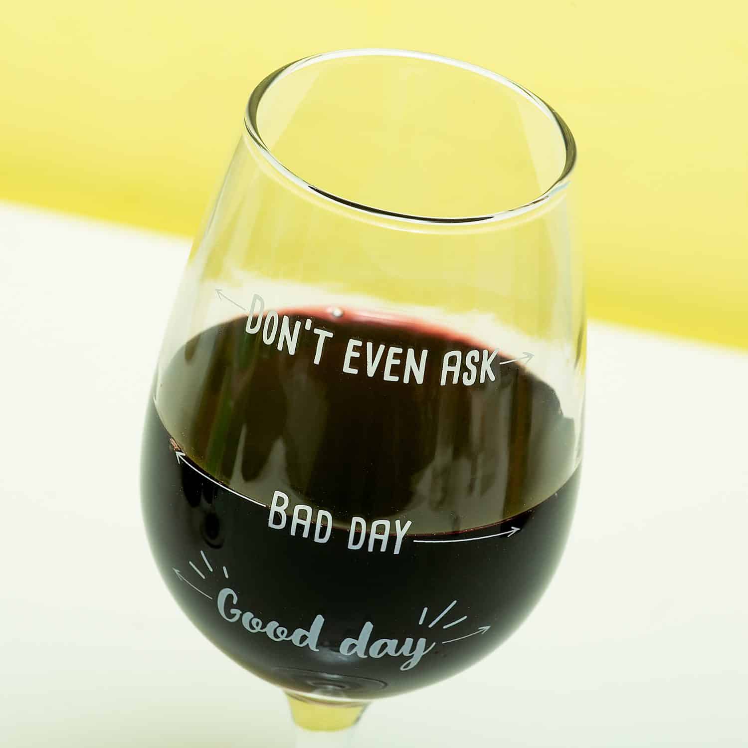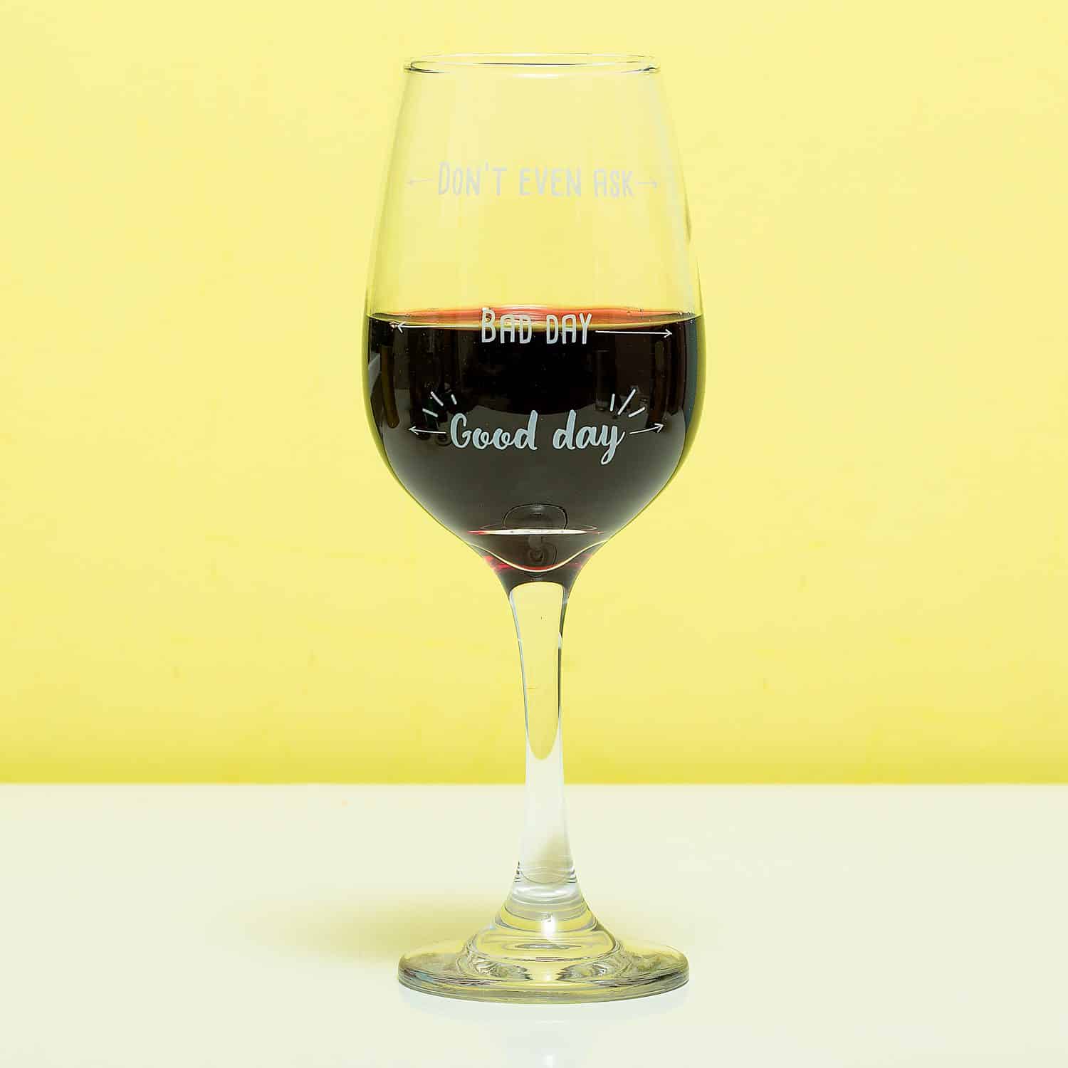War es ein guter Tag, ein schlechter Tag oder soll ich gar nicht erst fragen? Ihre Mitbewohner kรถnnen Ihre Stimmung leicht aus dem Weinglas Good Day Bad Day von Out of the Blue ablesen. Auf dem Glas stehen die Worte: Guten Tag, schlechten Tag und nicht einmal fragen. Sie fรผllen das Glas so voll, wie es Ihrer Stimmung entspricht.
