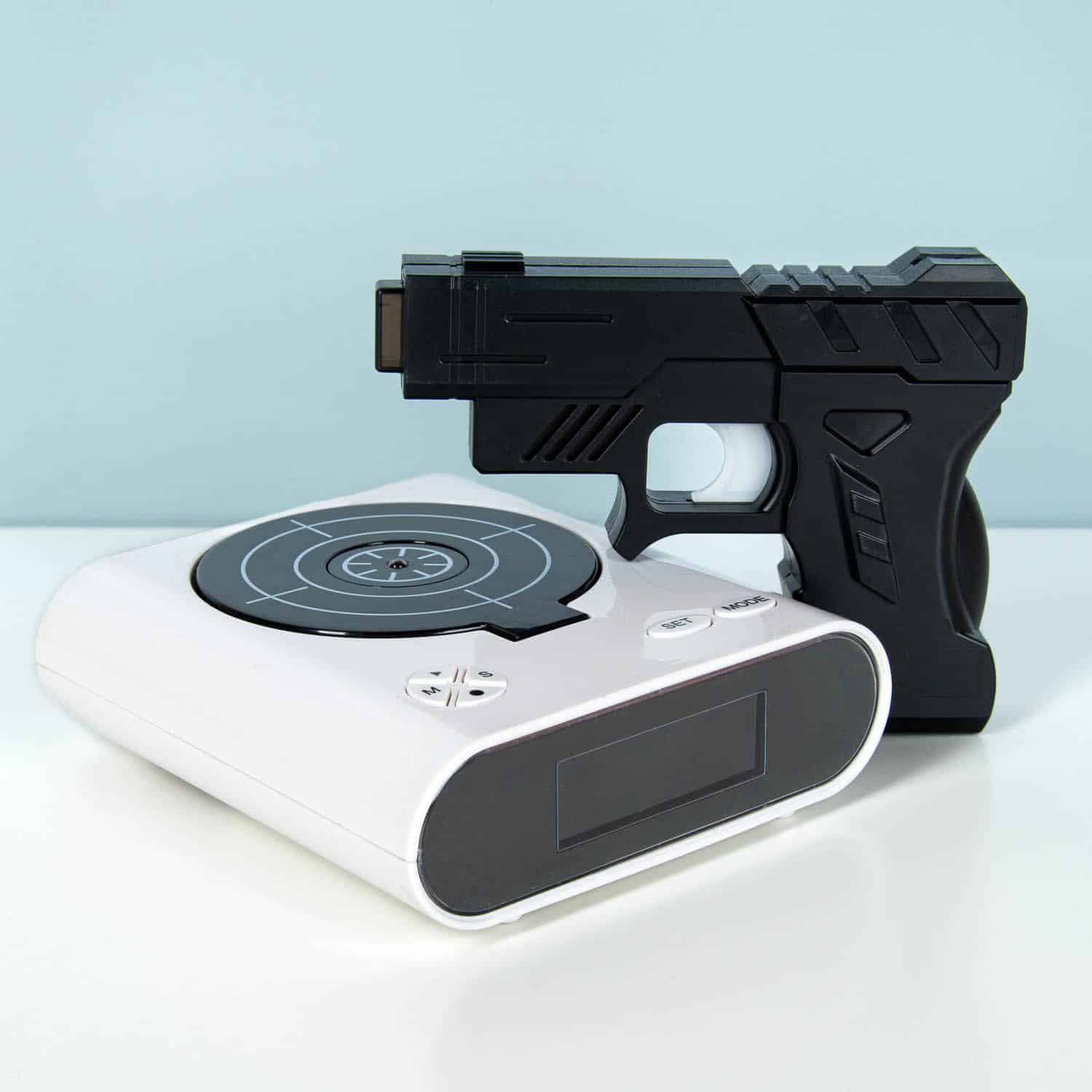 Mit dem Gun Wecker aufzuwachen, ist ein Vergnügen. Jeden Morgen erwartet dich die Herausforderung, den Wecker abzuschalten, aber wir garantieren dir: Einmal wach, kannst du direkt konzentriert in den Tag starten. Anstelle die Schlummertaste zu drücken, bietet dieser Wecker drei verschiedene Methoden, um abgeschaltet zu werden – und bei allen musst du mit der beiliegenden Infrarotpistole auf die Zielscheibe des Weckers schießen.