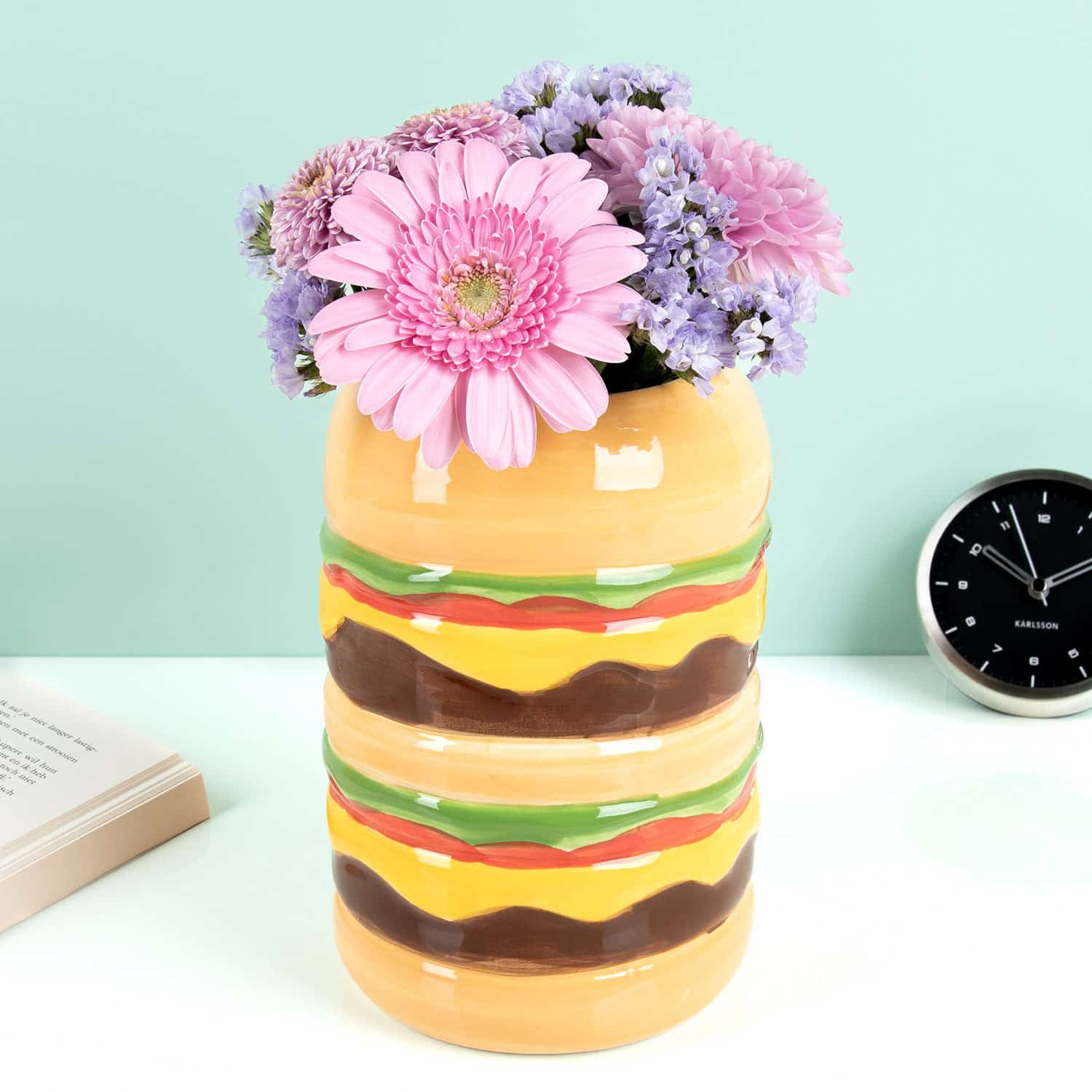 Ist dein Zuhause voller Retro-Sachen oder bist du total verrรผckt nach den amerikanischen Diners der 50er Jahre? Dann gehรถrt die Hamburger-Vase von DOIY definitiv in dein Zuhause. Diese coole Vase ist ein echter Hingucker: Sie sieht nรคmlich aus wie ein doppelter Cheeseburger. Kรคse, Burger, Tomate und Salat โ€“ alles ist in dieser kรถstlichen Vase vorhanden. Ein super Geschenk fรผr alle, die originelle Wohnaccessoires lieben.