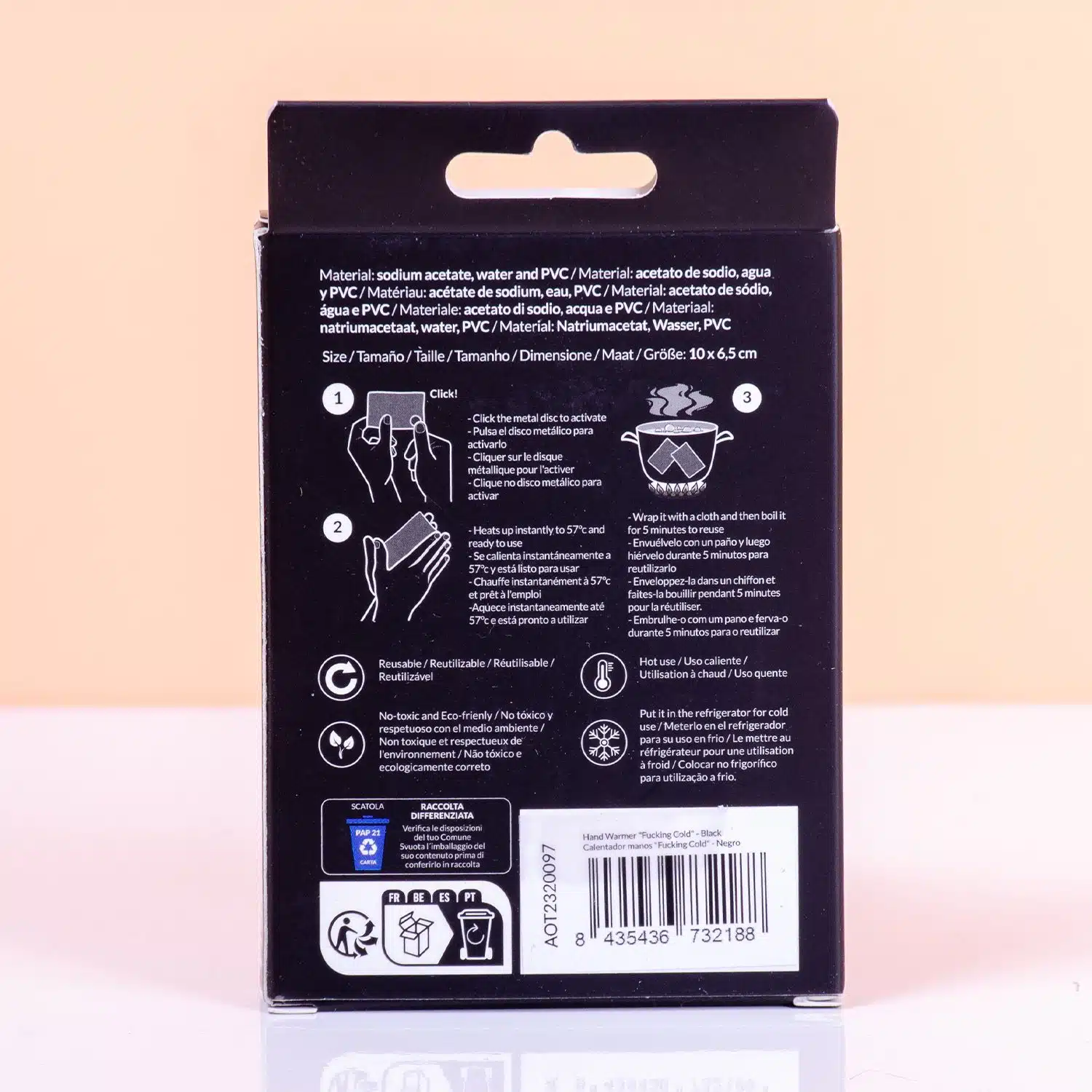 Leiden Sie im Winter immer unter kalten Händen? Der Fucking Cold Handwärmer von Fisura kann Ihnen dabei helfen. Dieser Handwärmer – mit dem Text Fucking Cold – ist mit einem wärmenden Gel gefüllt. Wenn man die Metallversiegelung aufbricht, erhitzt sich das Gel auf bis zu 57 Grad. So haben Sie im Handumdrehen warme Hände. Sie können den Handwärmer immer wieder verwenden. Legen Sie es mit einem Tuch in einen Topf mit heißem Wasser: Nach fünf Minuten ist es vollständig aufgewärmt.
