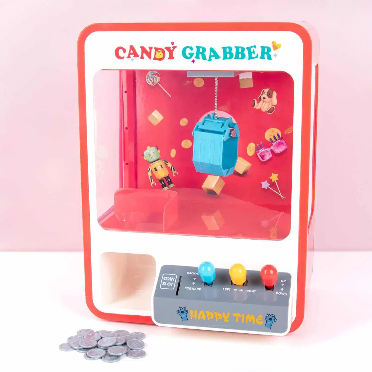 Keine Ahnung, was du für den Kindergeburtstag deines Sohnes oder deiner Tochter organisieren sollst? Kein Problem: Mit dem Happy Time Süßigkeitenautomat beschäftigen sich die Kinder ganz von selbst. Dieser lustige Automat sieht aus, als käme er direkt von der Kirmes. Du befüllst ihn mit Süßigkeiten, und die Kinder versuchen, sie mithilfe der Joysticks zu greifen. Der Greifautomat wird mit Plastikmünzen geliefert: Für jede Runde benötigt man eine Münze und hat 60 Sekunden Zeit, ein Süßigkeit zu greifen.