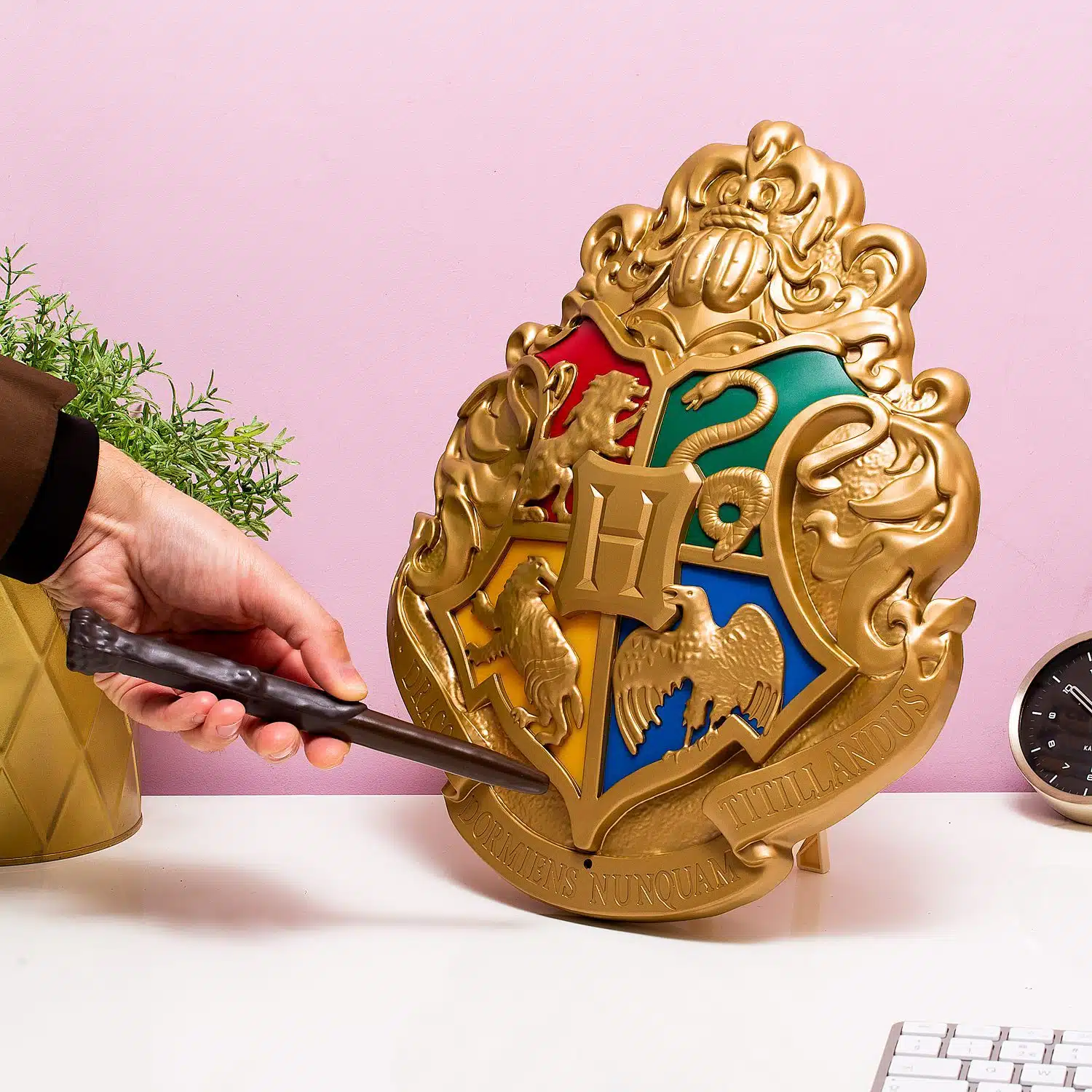 - Lampe, die wie der Hogwarts-Schild aussieht