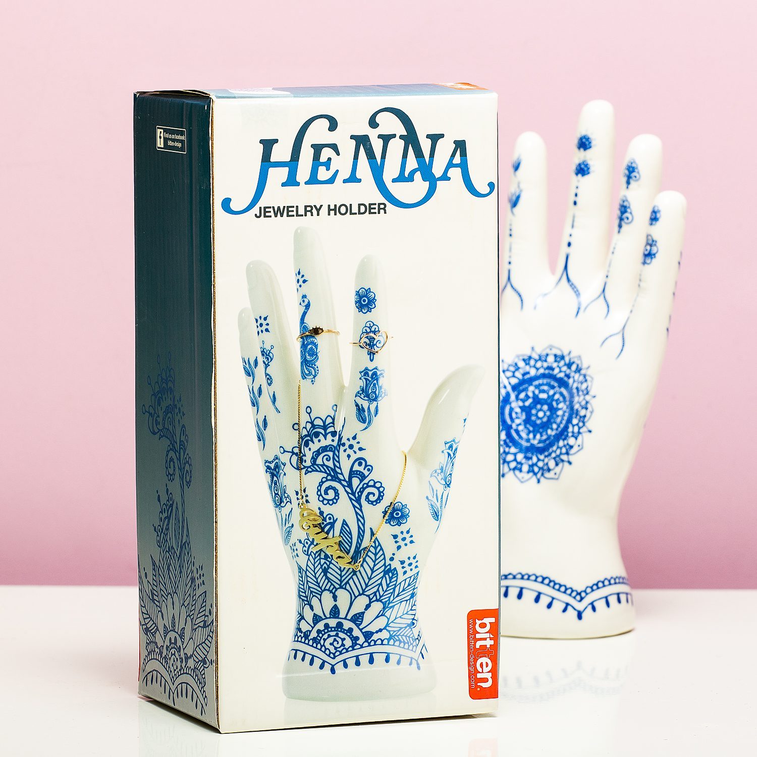 Her mit all dem schรถnen Schmuck, denn Sie haben viel Platz, um ihn aufzubewahren. Der Henna Schmuckhalter von Bitten ist ein Schmuckhalter in Form einer Hand mit ausgestreckten Fingern. Hier kรถnnen Sie Ihre Ringe, Armbรคnder, Ohrringe und Halsketten aufhรคngen.Die Hand ist weiร und hat eine blaue Henna-Dekoration. Ein Bild in Ihrem Interieur, mit oder ohne Schmuck.