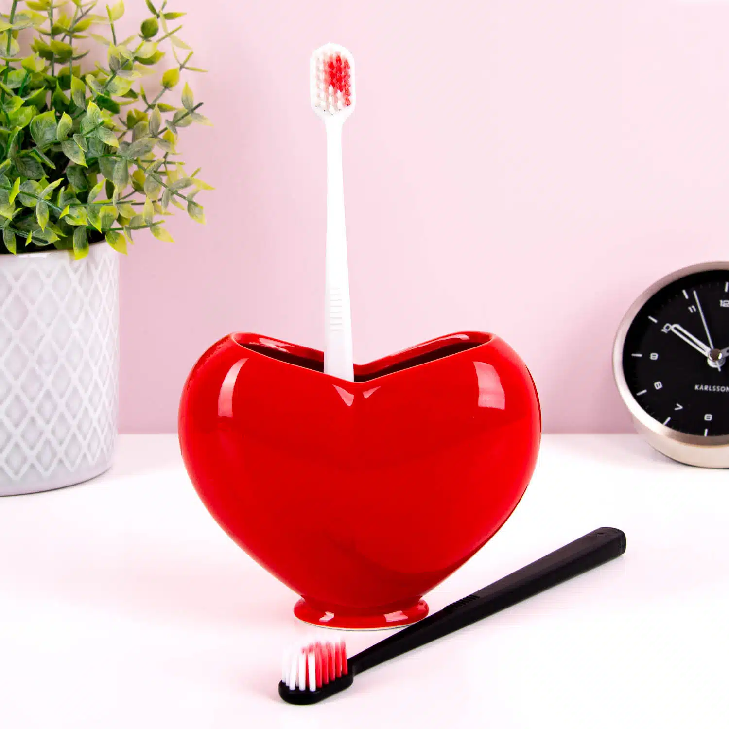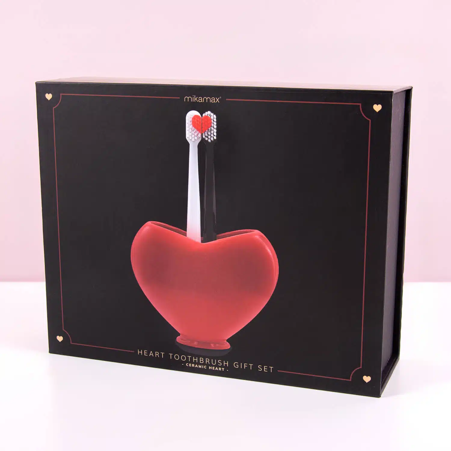 Suchst du ein romantisches Geschenk zur Wohnungseinweihung oder willst deinem Schatz einfach mal eine Freude machen? Dann ist die Herz-Zahnbürstenset von MikaMax genau das Richtige! Die Set besteht aus zwei Zahnbürsten, deren rote Borsten gemeinsam ein Herz bilden – und sie stehen eng beieinander in einem herzförmigen Zahnbürstenhalter aus Keramik. Liebe auf den ersten Blick – auch im Badezimmer!